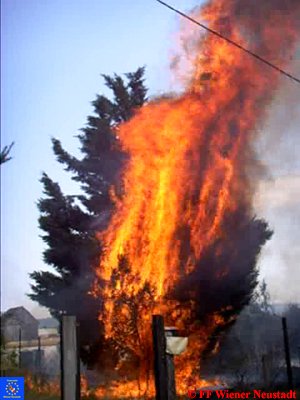 Beim Eintreffen der Fahrzeuge stand bereits ein Teil eines Vorgartens, bedingt durch die Trockenheit, in Brand. Auch der dort befindliche Baum fing Feuer und brannte bald komplett.