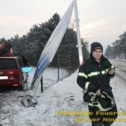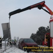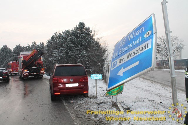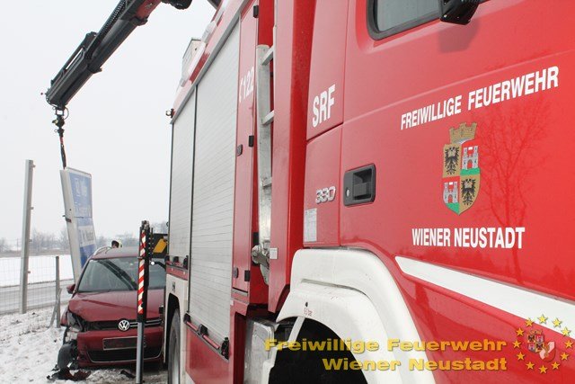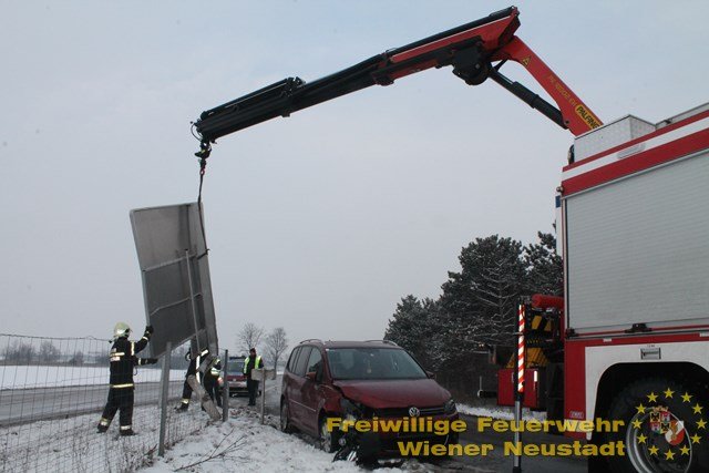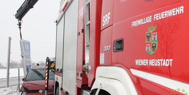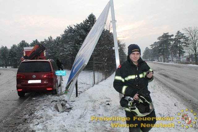 Kurz nach der Alarmierung durch die Polizei gegen 15 Uhr rückte die Feuerwehr Wiener Neustadt zu einem Verkehrsunfall aus. Aus Wiener Neustadt kommend, rutschte eine Wiener Pkw-Lenkerin mit Ihrem Fahrzeug gegen das 2,5 x 2,5 Meter große Hinweisschild und riss dieses aus der Verankerung.