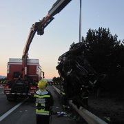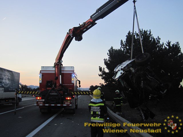Der Tag für die Feuerwehr Wiener Neustadt begann um halb sieben in der Früh. Ein Volkswagen, der mit drei Personen besetzt war, verfehlte kurz vor der Autobahnabfahrt Wiener Neustadt West die Fahrspur und fuhr frontal in die Leitplanke. Dadurch hob das Fahrzeug ab, kollidierte mit einem Verkehrsschild und überschlug sich. Alle drei Insassen wurden dabei unbestimmten Grades verletzt und mussten von der Rettung versorgt und abtransportiert werden. Die Feuerwehr führte hier mit dem Kran des schweren Rüstfahrzeuges die Fahrzeugbergung durch. Das Unfallwrack wurde anschließend von einem Privatunternehmen von der Autobahn abtransportiert.