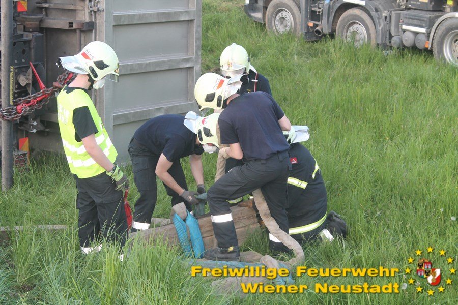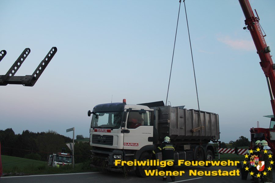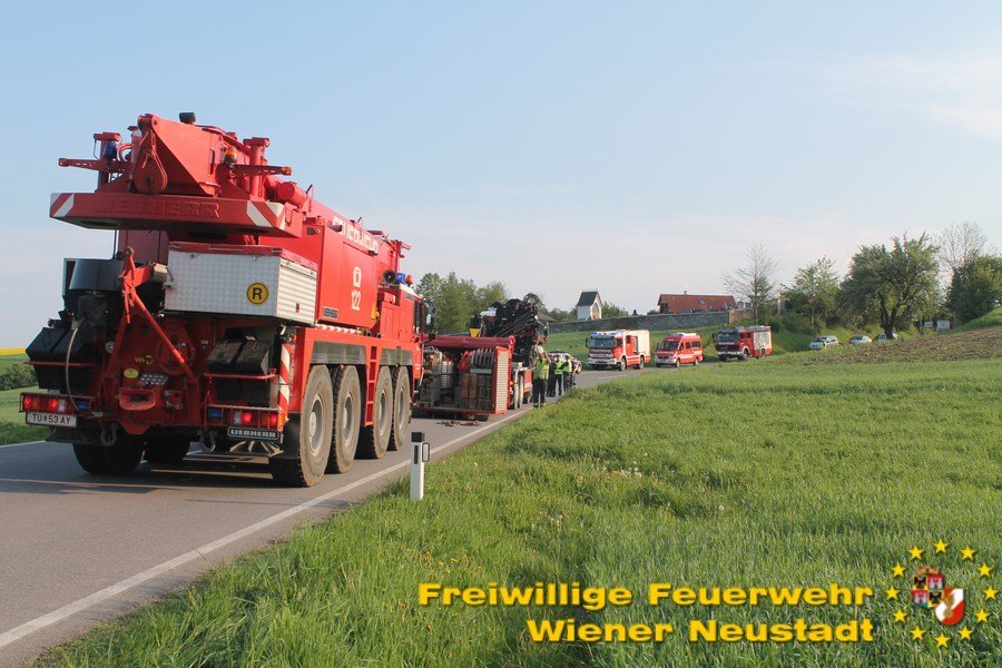 Der Notruf ging kurz vor halb drei Uhr nachmittags ein. Kurz darauf wurde die örtlich zuständige Feuerwehr Hochwolkersdorf zu einer Lkw- Bergung alarmiert. Nachdem der Leck geschlagene Dieseltank abgedichtet war, verständigte der Einsatzleiter nach 16 Uhr die Feuerwehr Wiener Neustadt. Die Feuerwehr Wiener Neustadt, wo für solche Fälle ein schweres Kranfahrzeug stationiert ist, rückte kurz nach der Alarmierung mit mehreren Fahrzeugen, zur Unterstützung aus.