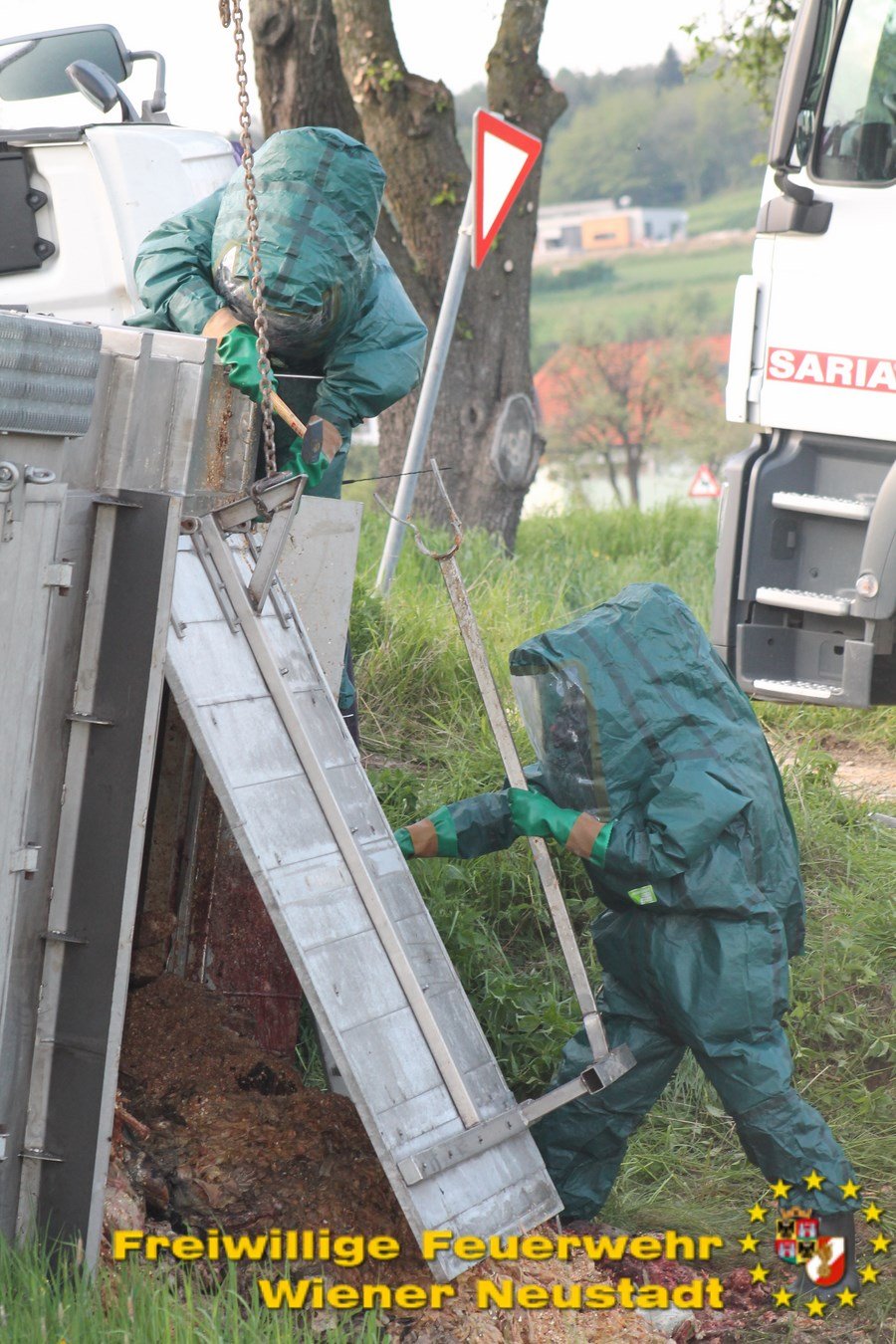 Neben der FF Wr. Neustadt wurde auch die Feuerwehr Wiesmath nachalarmiert. Diese rückte mit dem Atemschutzanhänger aus, um die örtliche Feuerwehr zu unterstützen. Um, während des Umladens der Tierkadaver, im Nahbereich des Lkws arbeiten zu können, musste mit Schutzanzügen der Schutzstufe III unter Umluft unabhängigen Atemschutz vorgegangen werden. Diese Anzüge, welche normalerweise bei schweren Chemieunfällen eingesetzt werden, waren nötig, weil die verwesenden Überreste vom Schlachthof, neben dem bestialischen Gestank, auch eine gesundheitliche Gefährdung für die Einsatzkräfte darstellte. Auch nachdem die Ladung entfernt war, wurde weiterhin mit Atemmasken gearbeitet, da die Geruchsbelästigung weiterhin präsent war.