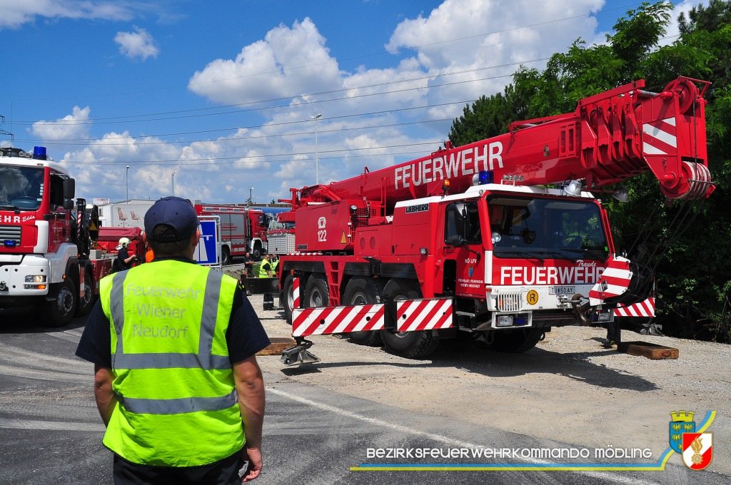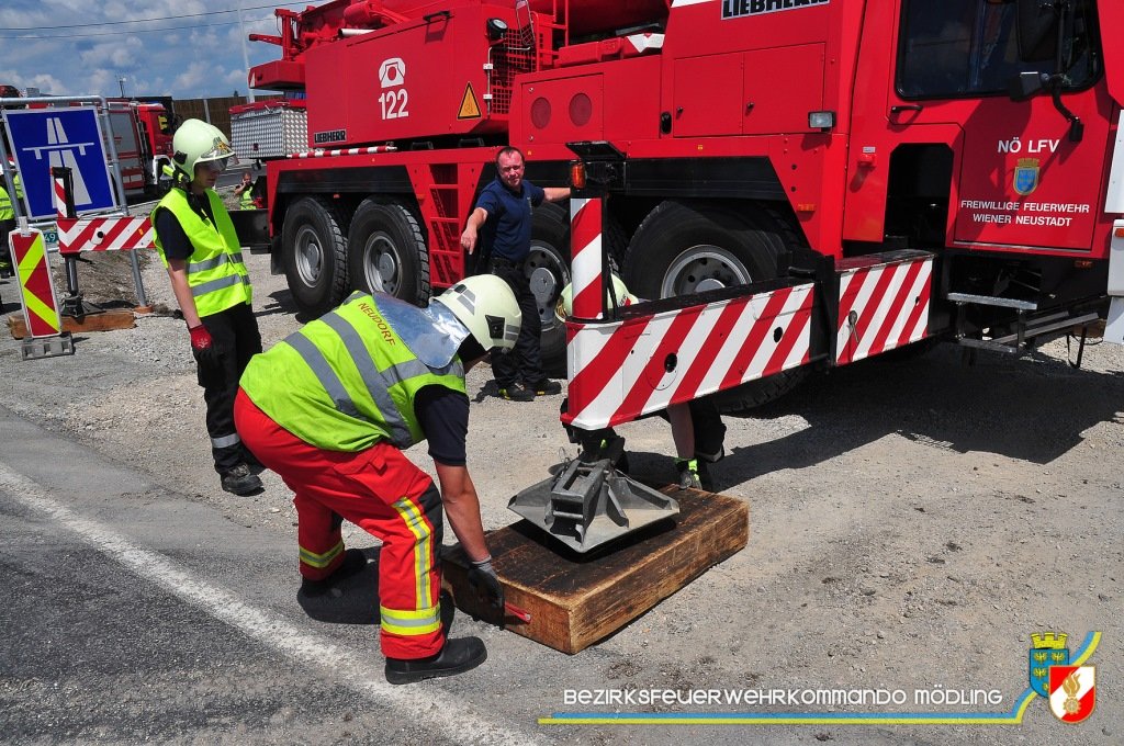 Da der Lkw sich gefährlich zur Seite neigte, entschied der Einsatzleiter der Feuerwehr Wiener Neudorf ein Kranfahrzeug der Feuerwehr zu alarmieren. Aufgrund der Verfügbarkeit wurde das Kranfahrzeug Wiener Neustadt zum Einsatz gerufen. Die Feuerwehr Wiener Neustadt rückte mit dem Kranfahrzeug und dem Last 4 samt Kranbegleitcontainer zur Unterstützung an.