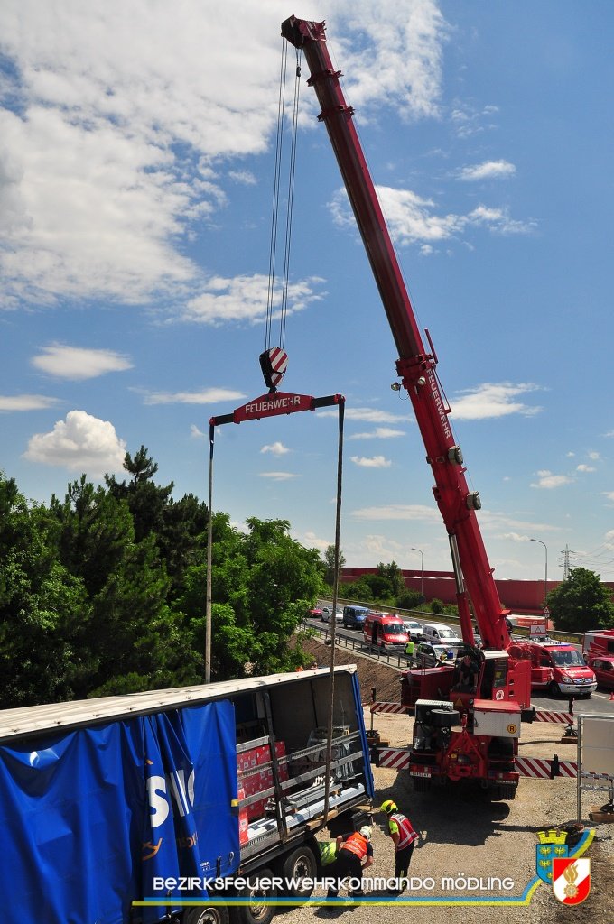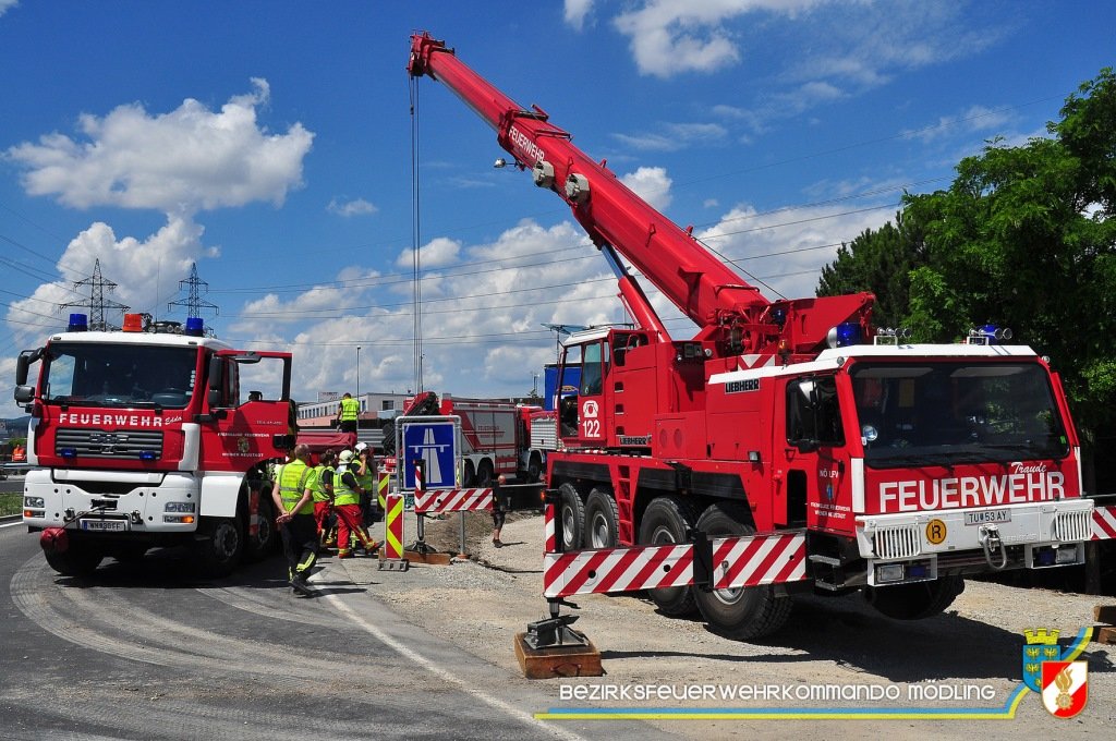 Die Feuerwehr Wiener Neustadt wurde mit dem vom NÖ Landesfeuerwehrverband ebendort stationierten Kranfahrzeug nach Wiener Neudorf zur Unterstützung gerufen. Ein mit Weinkartons und Leitschienen beladener Lkw kam bei der Zufahrt zur Baustelle des Autobahnknotens Wiener Neudorf ins Bankett.