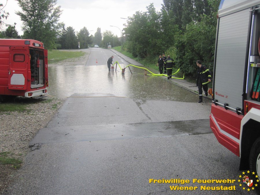 Kurz nachdem es gegen 13.00 Uhr zu massiven Regenfällen kam, wurden die ersten Sturmeinsätze gemeldet. Bis der Regen gegen 15.00 wieder deutlich nachließ, rückte die Feuerwehr Wiener Neustadt zu insgesamt elf wetterbedingten Einsätzen aus. In mehreren Kellern stand das Wasser zentimeterhoch und musste von der Feuerwehr abgepumpt werden. Aber auch ein Straßenzug entlang der Werftgasse stand großflächig unter Wasser.
