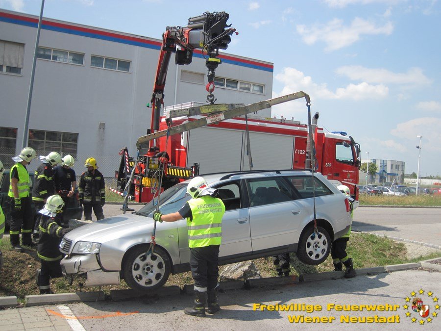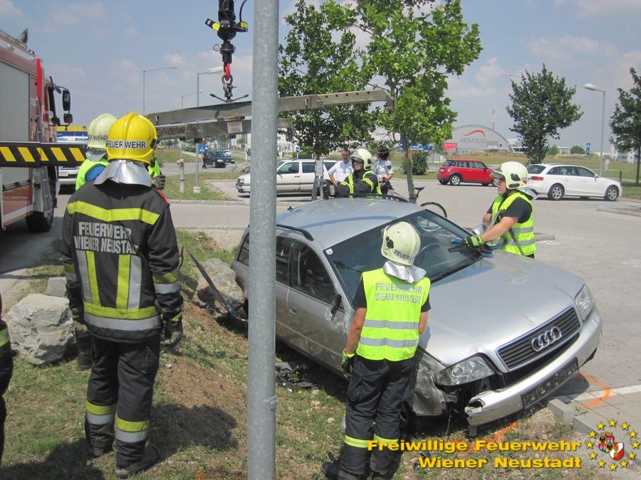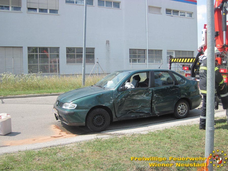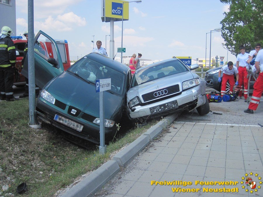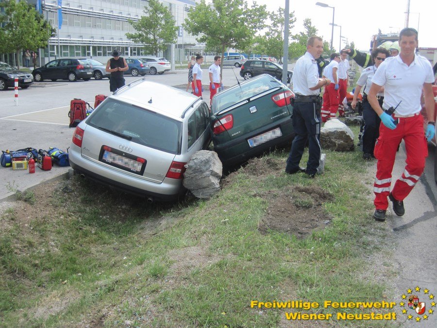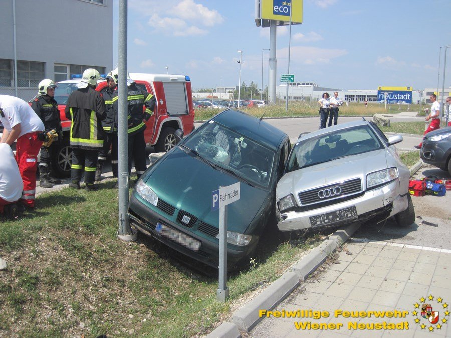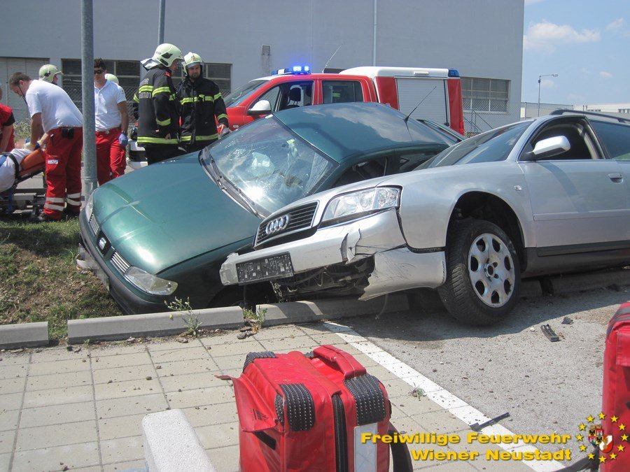 Um 13:35 am Freitag, 18.07.14, meldete 144 Notruf Niederösterreich der Bezirksalarmzentrale Wiener Neustadt einen schweren Verkehrsunfall in der Civitas Nova. Laut erstem Meldebild war von zwei eingeklemmten Personen auszugehen. Daraufhin wurde eine Vielzahl an Einsatzkräften von Feuerwehr und Rotem Kreuz zu der Unfallstelle alarmiert. Die Feuerwehr rückte mit vier Fahrzeugen und 16 Mann aus.