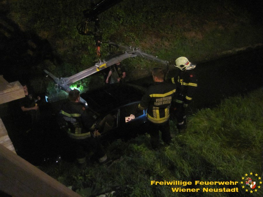 Die Feuerwehr musste das Fahrzeug anschließend mit einem Kran heben und anschließend auf einem Parkplatz abstellen, wo das Wasser, welches ca. 20 cm im Fahrzeug stand, abfließen konnte.