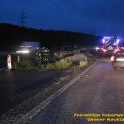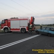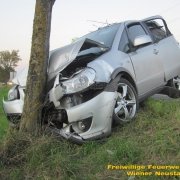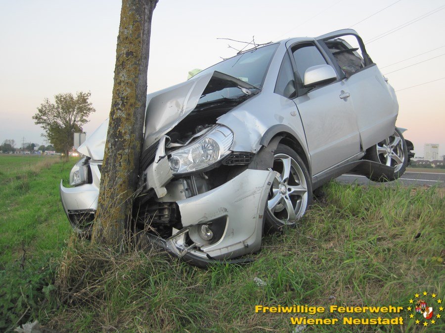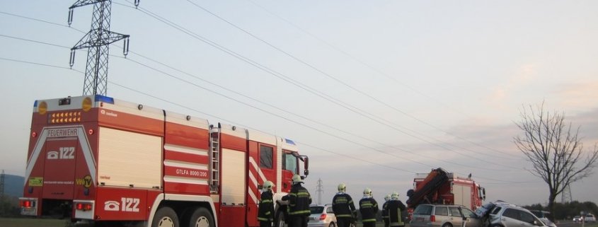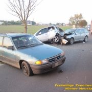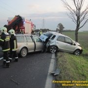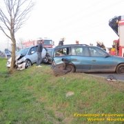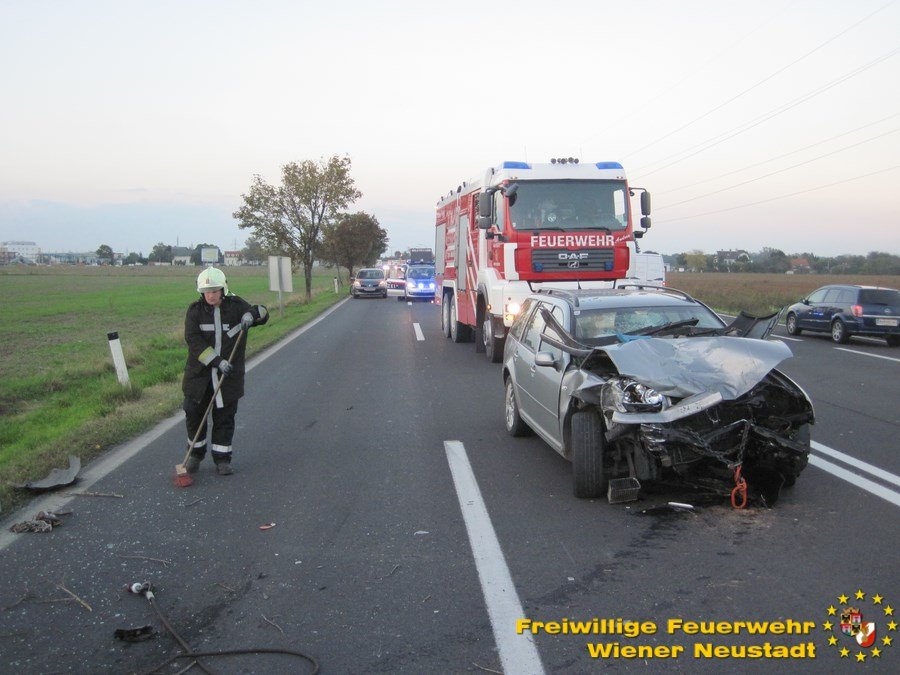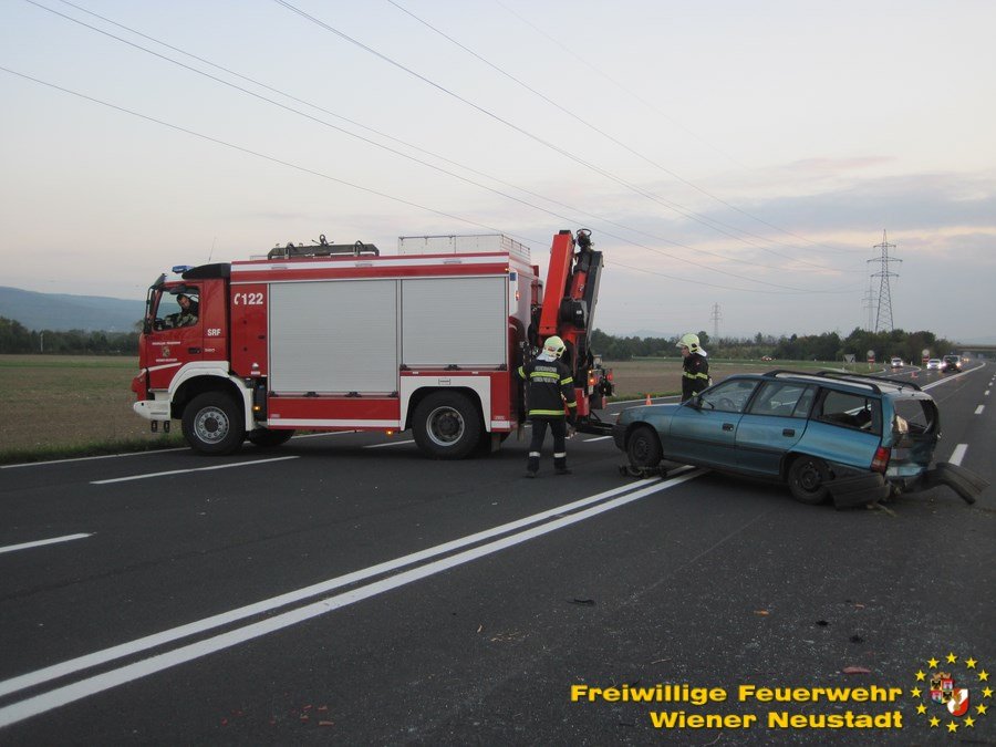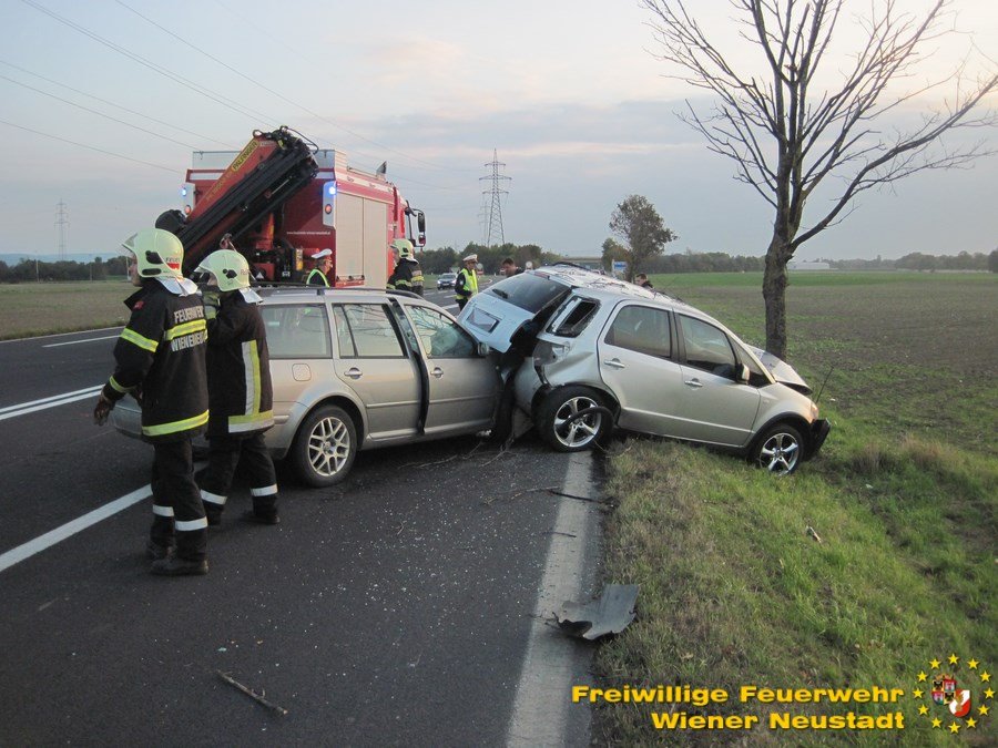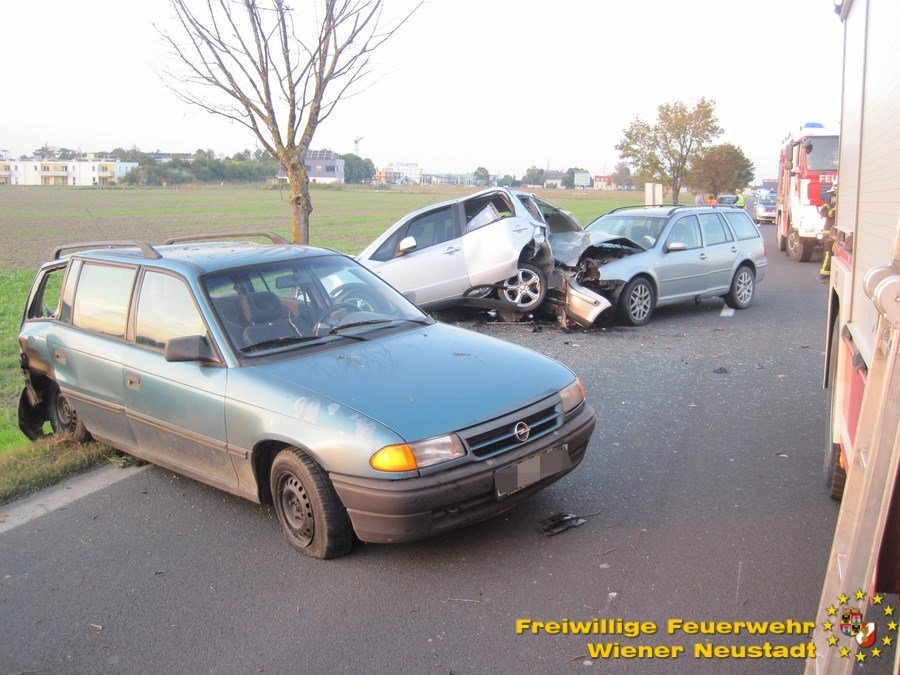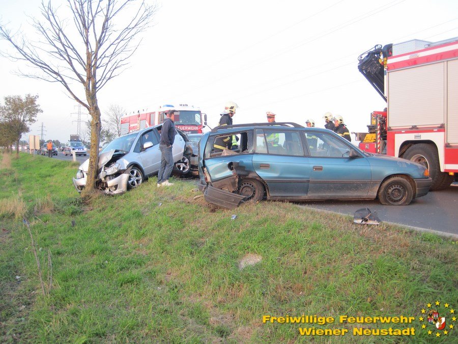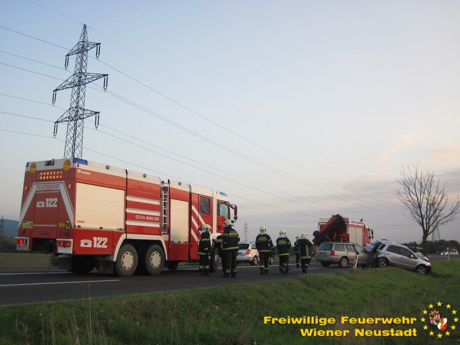 Drei Pkws kollidierten gegen 17.50 Uhr auf der S4 bei Wiener Neustadt miteinander. Zwei ungarische Pkws standen aufgrund einer Reifenpanne am Straßenrand der Schnellstraße. Aus unbekannter Ursache kollidierte ein aus dem Bezirk Wiener Neustadt- Land kommender VW- Passat Lenker mit den stehenden Fahrzeugen. Durch die Wucht des Aufpralles wurde ein Fahrzeug in einen Baum gedrückt und schwer beschädigt. Die beiden Ungarn konnten noch in den Straßengraben hechten und blieben unverletzt. Der Passat- Lenker wurde unbestimmten Grades verletzt und musste vom Roten Kreuz ins Landesklinikum Wiener Neustadt gebracht werden. Einige zufällig anwesende Sanitäter und ein Notarzt aus Neunkirchen leisteten Erste Hilfe und sicherten bis zum Eintreffen der Einsatzkräfte die Unfallstelle ab.