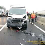 27.10.2014, 06:40 Uhr, A2 Südautobahn, Fahrtrichtung Wien: Eindeutig keine gute Zeit für einen Verkehrsunfall. Dennoch: Ein Klein-Lkw fuhr im dichten Morgenverkehr auf eine vor ihm fahrende Pritsche auf, war fahruntüchtig und blockierte die dritte Spur auf Höhe Raststation Föhrenberg. Die Rettungsgasse wurde vorbildlich gebildet und die Feuerwehr konnte rasch zum Einsatzort anrücken. Die Unfallstelle wurde von der Feuerwehr abgesichert und die Verkehrswege freigemacht. Das defekte Fahrzeug wurde von einem privaten Abschleppunternehmen von der Autobahn entfernt.