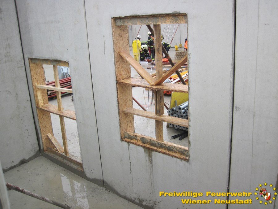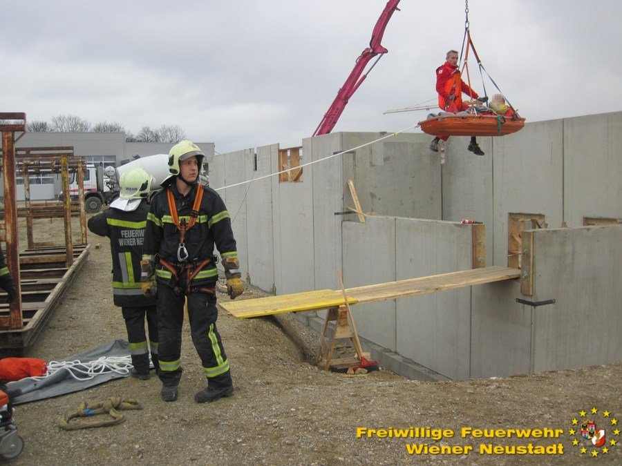Die Feuerwehr rückte mit drei Fahrzeugen aus. Mittels Hubsteiger wurde die Rettung des Mannes vorbereitet. Der Verletzte wurde in eine Korbschleiftrage gelegt und anschließend mit dem Baustellenkran aus der Baugrube gehoben. Außerhalb wartete bereits der Notarzt, welcher ihn ins Landesklinikum Wiener Neustadt verbrachte.