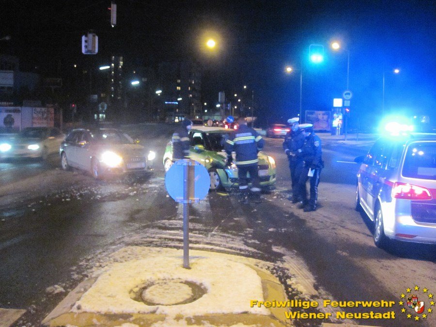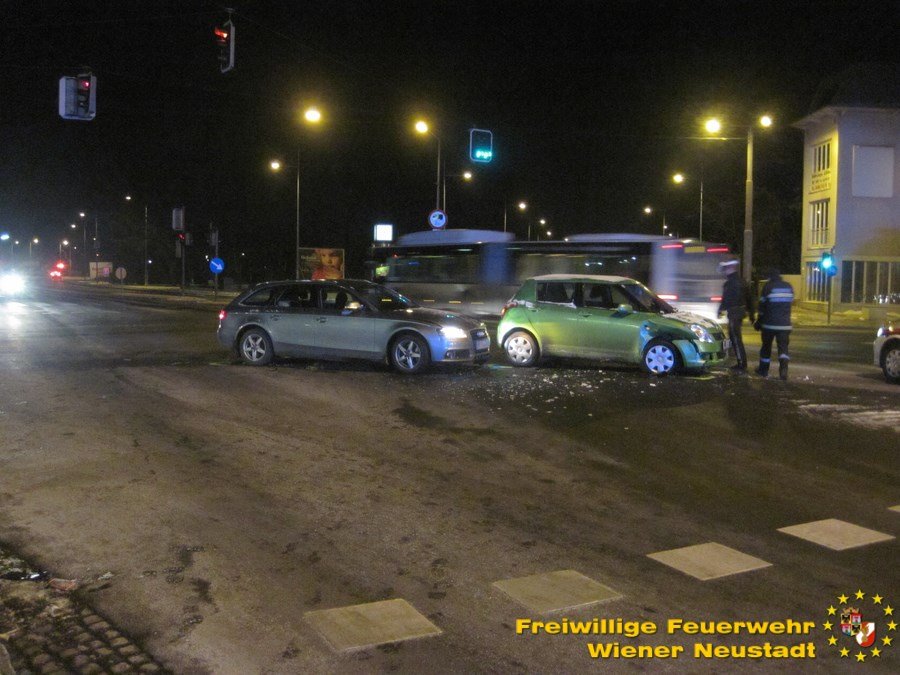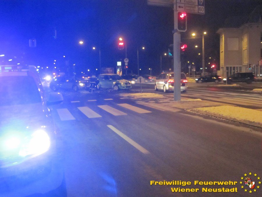 Zwei Verletzte forderte ein Verkehrsunfall am Dienstag Abend in der Innenstadt von Wiener Neustadt. Am Auge Gottes kollidierten zwei Pkws miteinander und blieben beschädigt im Kreuzungsbereich stehen. Die Lenker wurden unbestimmten Grades verletzt und mussten ins Landesklinikum Wiener Neustadt gebracht werden.