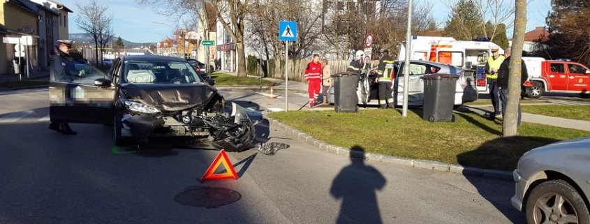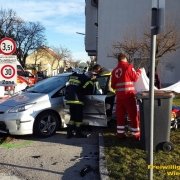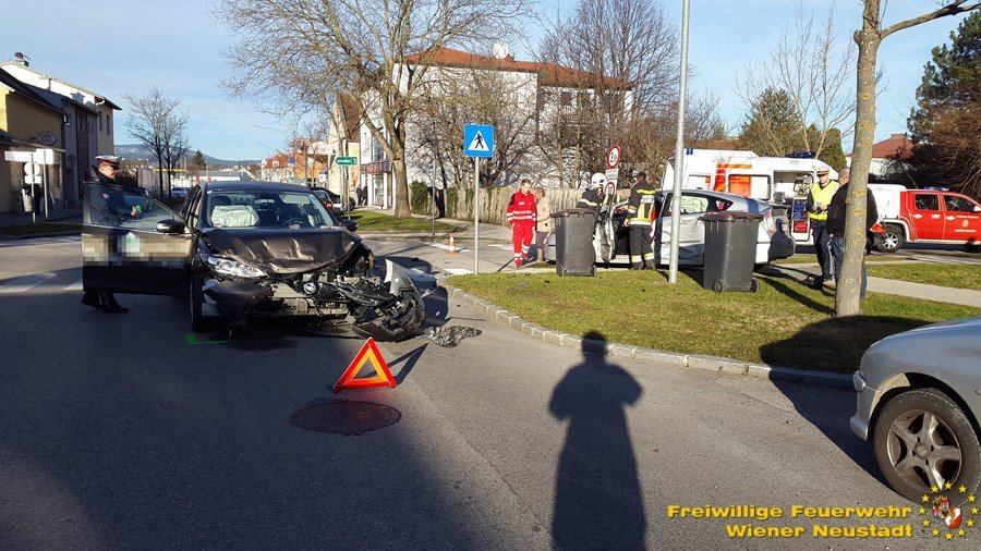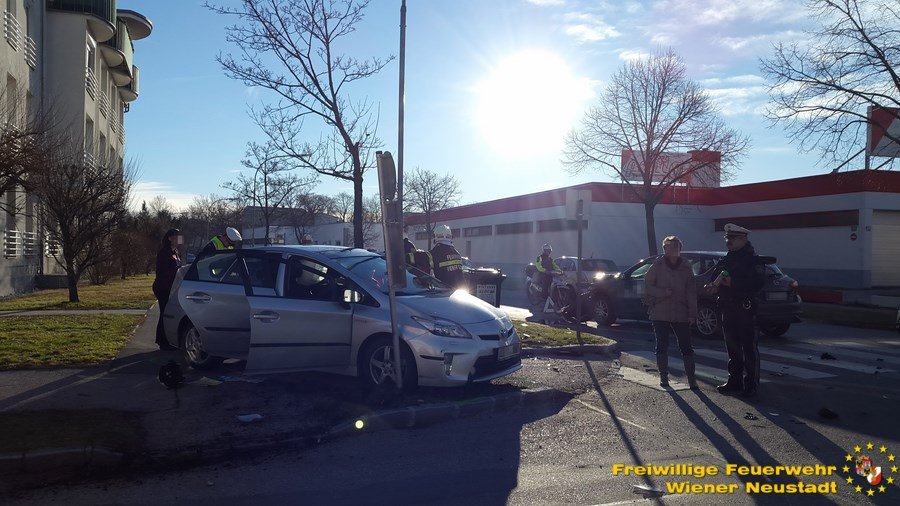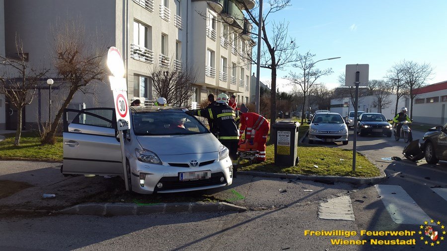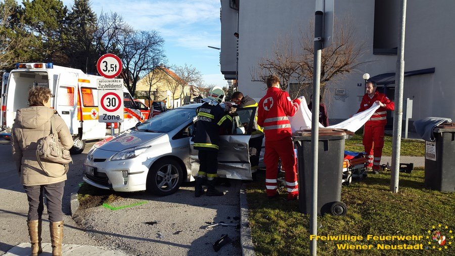 Gegen viertel zehn wurde die Feuerwehr vom Roten Kreuz zu einem Verkehrsunfall im Stadtgebiet nachgefordert. Im Kreuzungsbereich stießen zwei Pkws aus unbekannter Ursache zusammen. Beim Eintreffer der Feuerwehr war die Lenkerin aus Ternitz in ihrem Toyota Prius eingeschlossen glücklicherweise jedoch nicht eingeklemmt. Die Feuerwehr befreite die Frau mit Hilfe des hydraulischen Rettungsgerät. Anschließend wurden beide Lenker mit Verletzungen unbestimmten Grades vom Roten Kreuz ins Landesklinikum Wiener Neustadt gebracht.
