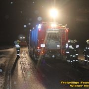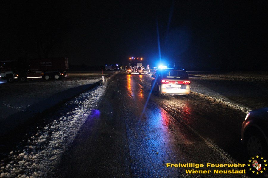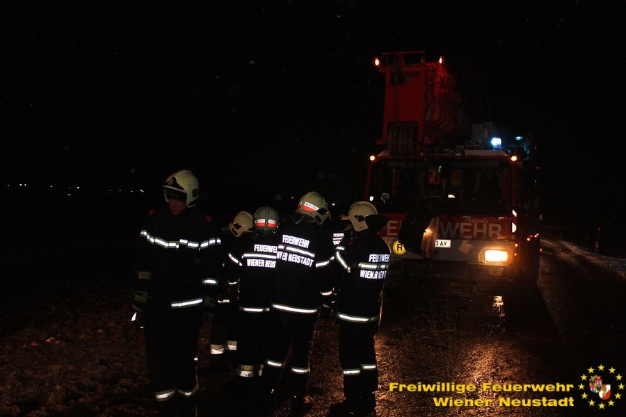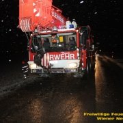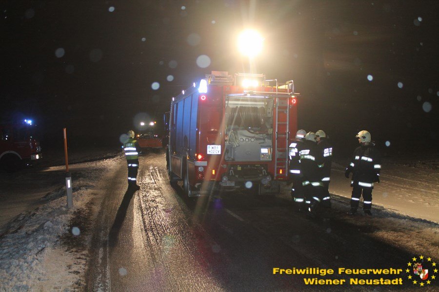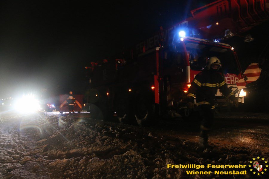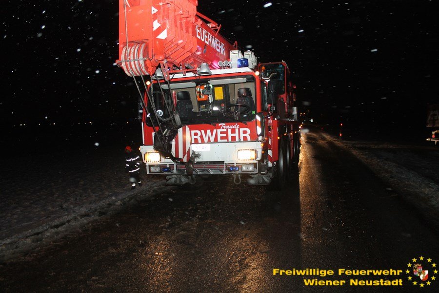 Die Feuerwehr Wiener Neustadt rückte um halb sieben mit dem schweren Kranfahrzeug und den Begeleitfahrzeugen aus. Eine freie Fahrtroute zu finden gestaltete sich jedoch nicht leicht. Auf dem Weg nach Matzendorf war die Straße bereits von der FF Theresienfeld gesperrt worden, weil auf der Badenerstraße mehrere liegen gebliebene Fahrzeuge den Weg versperrten. Auf der Ausweichroute durch die Heideansiedlung waren ebenfalls zwei Pkw im Schnee stecken geblieben. Diese konnten jedoch rasch aus dem Schnee gezogen werden und konnten die Fahrt selbst weiterführen.
