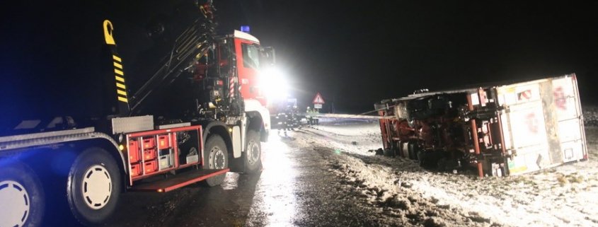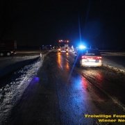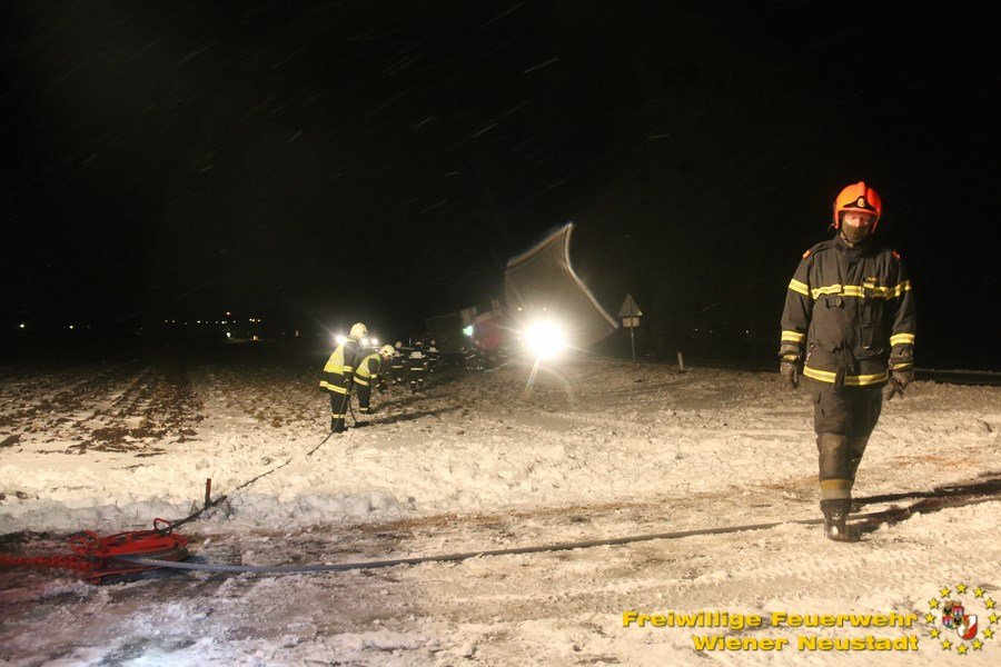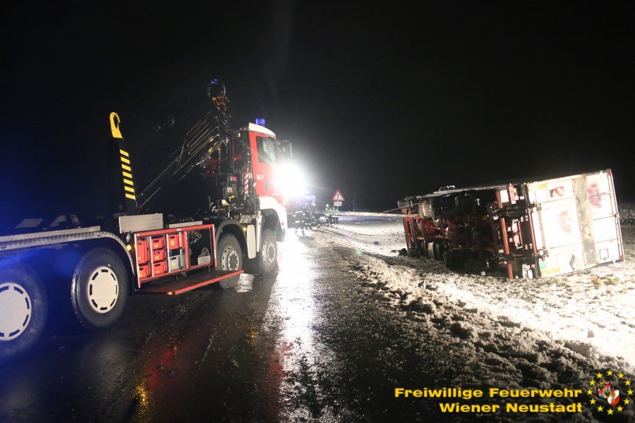 Da sich das Wetter im Laufe des Tages kaum besserte, änderte sich auch die Einsatzlage der Feuerwehren im Bezirk Wiener Neustadt nicht. Fast im Minutentakt wurden am Nachmittag die Notrufe bearbeitet und die Feuerwehren meist zu Fahrzeugbergungen alarmiert. Gegen 18:00 Uhr meldete ein Anrufer einen umgekippten Lkw zwischen Matzendorf und Leobersdorf.