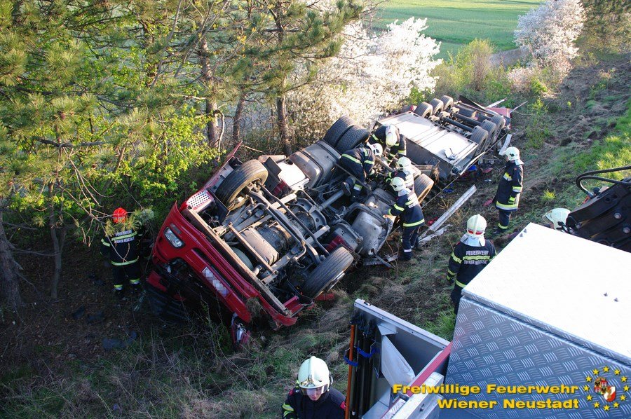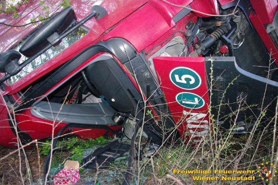 Zum zweiten Mal innerhalb einer Woche rückte die Feuerwehr Wiener Neustadt zu einer Lkw- Bergung aus. Auf der A2 kam ein slowakischer Lkw von der Fahrbahn ab und kippte aufs Dach. Obwohl die Fahrerkabine schwer deformiert war, konnte sich der 50- jährige Lenker selbstständig aus seinem Fahrzeug retten.