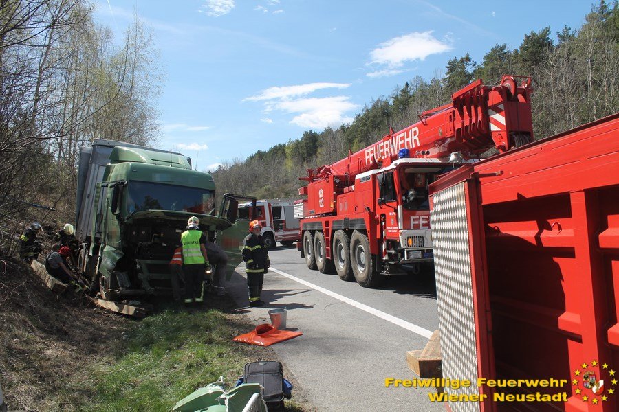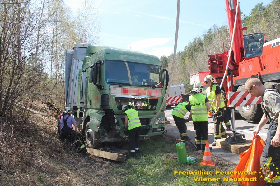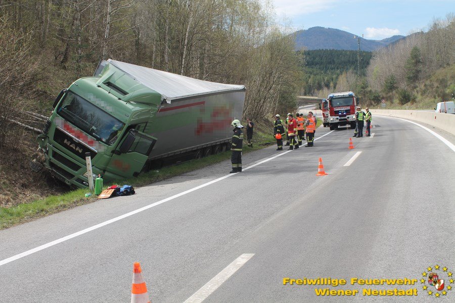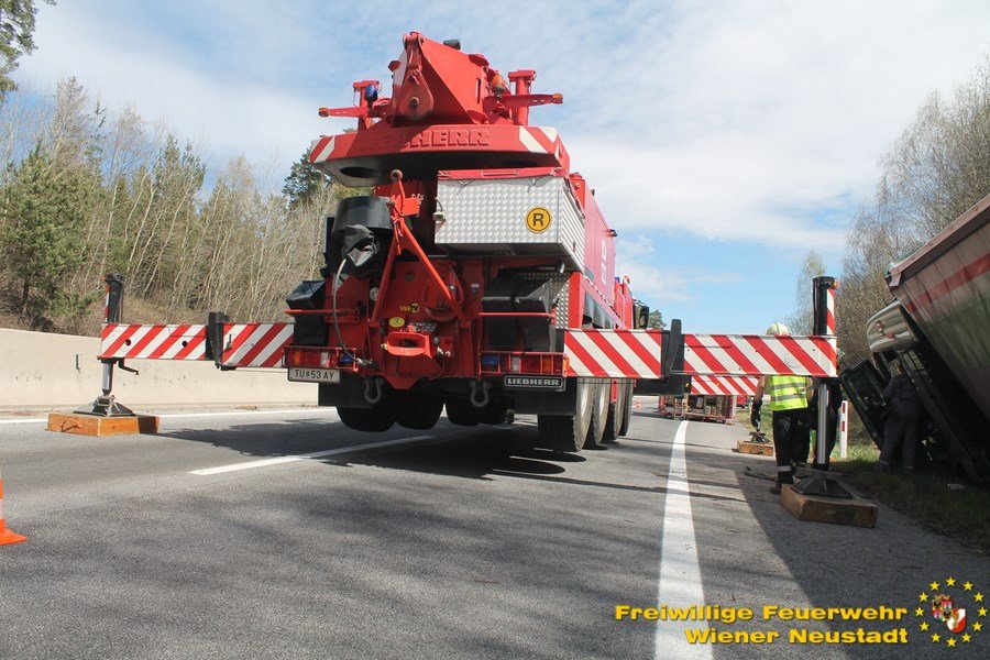 Die Feuerwehr Wiener Neustadt rückte daraufhin mit drei Fahrzeugen in Richtung S6 aus. Vor Ort wurde die Zugmaschine mittels Kran angehoben und gestützt. Nachdem die Zugmaschine wieder gerade auf festem Grund stand, wurde sie, mitsamt der Ladung, von einem weiteren Lkw auf die Fahrbahn zurückgeschleppt.