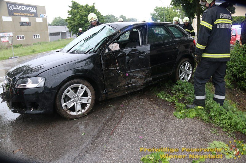 Die zu einer „eingeklemmten Person“ alarmierte Feuerwehr Wiener Neustadt rückte mit fünf Fahrzeugen an. An der Einsatzstelle konnte man rasch feststellen, dass das Fahrzeug einfach aus dem Graben geschleppt werden kann, ohne mit schwerem Gerät arbeiten zu müssen.