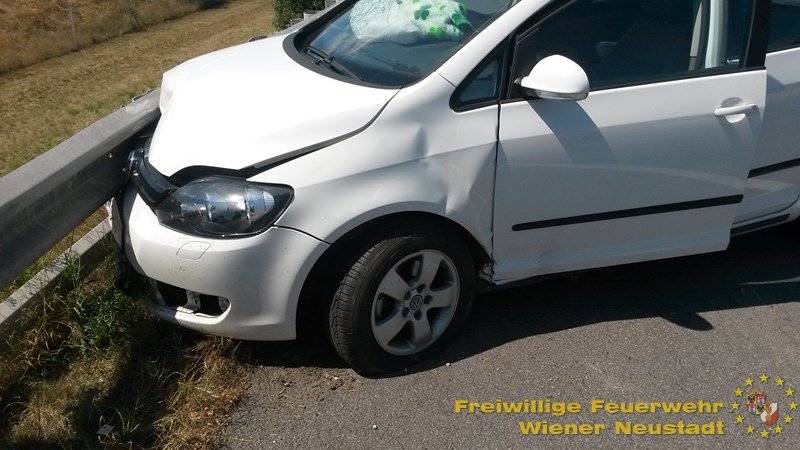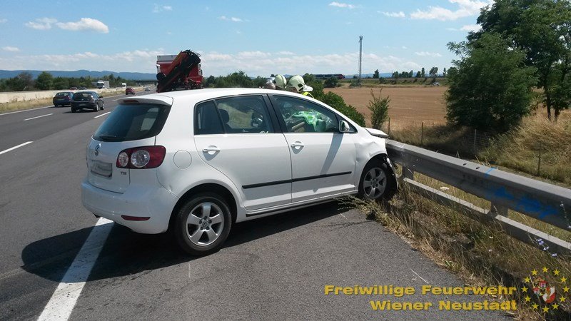 Aus bislang unbekannter Ursache endete die Fahrt eines weißen Pkw in der Leitschiene auf der A2, Richtungsfahrbahn Graz, kurz vor Wr. Neustadt – West. Das Fahrzeug traf – vermutlich von der dritten Fahrspur aus kommend – in spitzem Winkel die Leitschiene am rechten Fahrbahnrand.