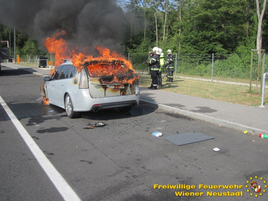 Am Autobahnrastplatz Wiener Neustadt in Fahrtrichtung Graz wurde ein Fahrzeugbrand gemeldet. Gegen 08:45 rückten zwei Fahrzeuge auf die Südautobahn aus. Vor Ort eingetroffen stand der Saab bereits in Vollbrand. Unter umluftunabhängigem Atemschutz wurde das Feuer mit einem Rohr abgelöscht. Nach rund einer Stunde konnte die Feuerwehr wieder einrücken.