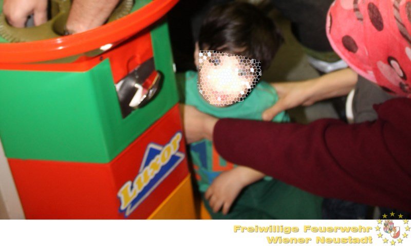 Dort angekommen war ein verängstigtes Kind mit seinem rechten Arm in einem Automaten vorzufinden. Die Mutter saß daneben und versuchte das Kind zu beruhigen.