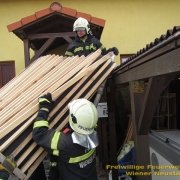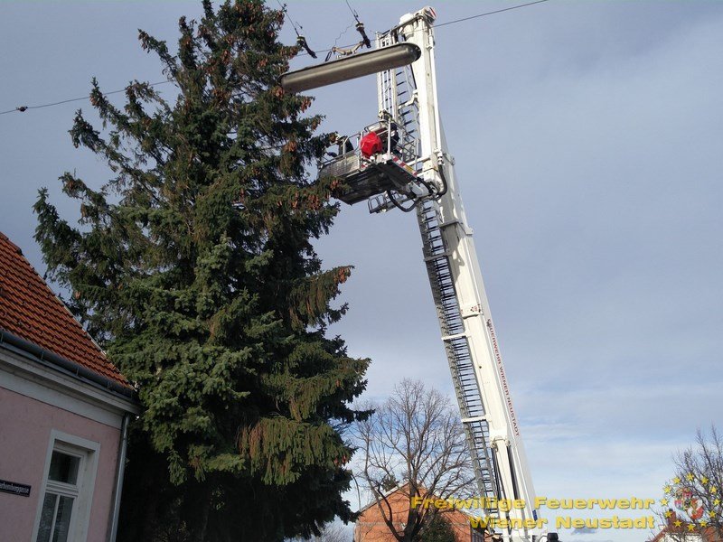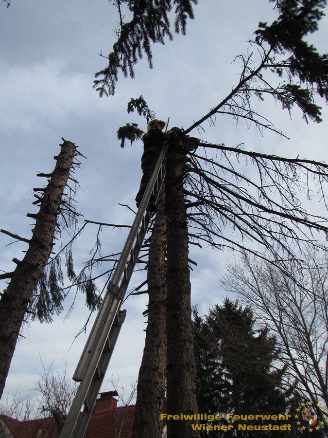 Drei Bäume in der Stahermberggasse wurden im Wind derart gebogen, dass der Wurzelstock sich lockerte. Die Feuerwehr entlastete die über 15 Meter hohen Nadelbäume indem die Äste entfernt wurden und die Bäume merklich gestutzt wurden.