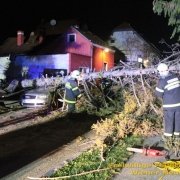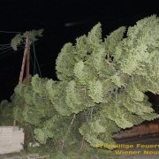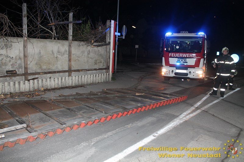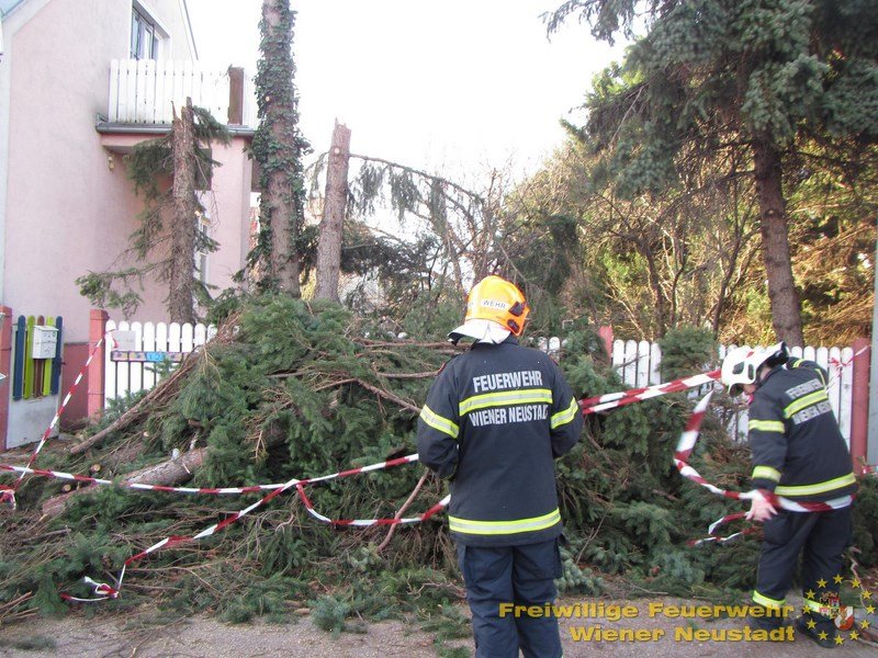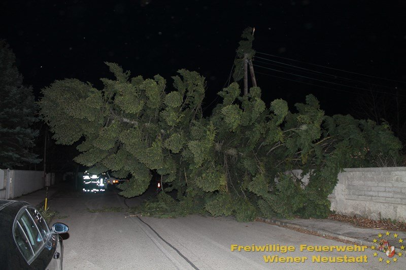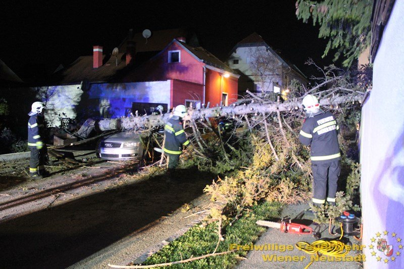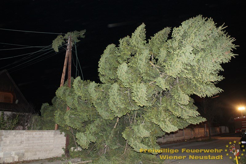 Eine Einsatzserie beschäftigt die Feuerwehren im Bezirk Wiener Neustadt seit kurz nach 3 Uhr morgens. Sturmböen bis 130 km/h bringen Bäume zu Sturz und decken Häuser ab. In der Stadt Wr. Neustadt fiel ein Baum auf Stromleitungen und riss diese ab. 75 Haushalte sind ohne Strom.