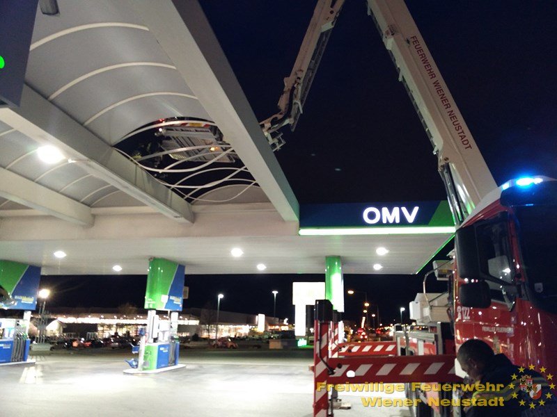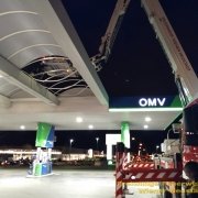 Dies betrifft auch eine Tankstelle im Stadtgebiet: Dachteile lösten sich. Es besteht Absturzgefahr der Teile, weshalb der betroffene Bereich ebenfalls abgesperrt wurde.