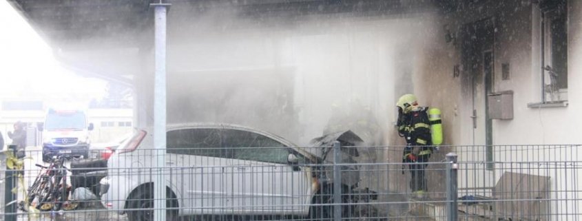 Gleich mehrere Notrufe trafen um kurz vor halb elf Uhr vormittags am ersten Sonntag im neuen Jahr in der Bezirksalarmzentrale ein. Unter einem Carport brennt ein Fahrzeug. Nachbarn begannen sofort mit Handfeuerlöschern mit den ersten Löschversuchen und konnten das Feuer zumindest so weit eindämmen, dass das Feuer auf das Haus nicht übergreifen konnte.