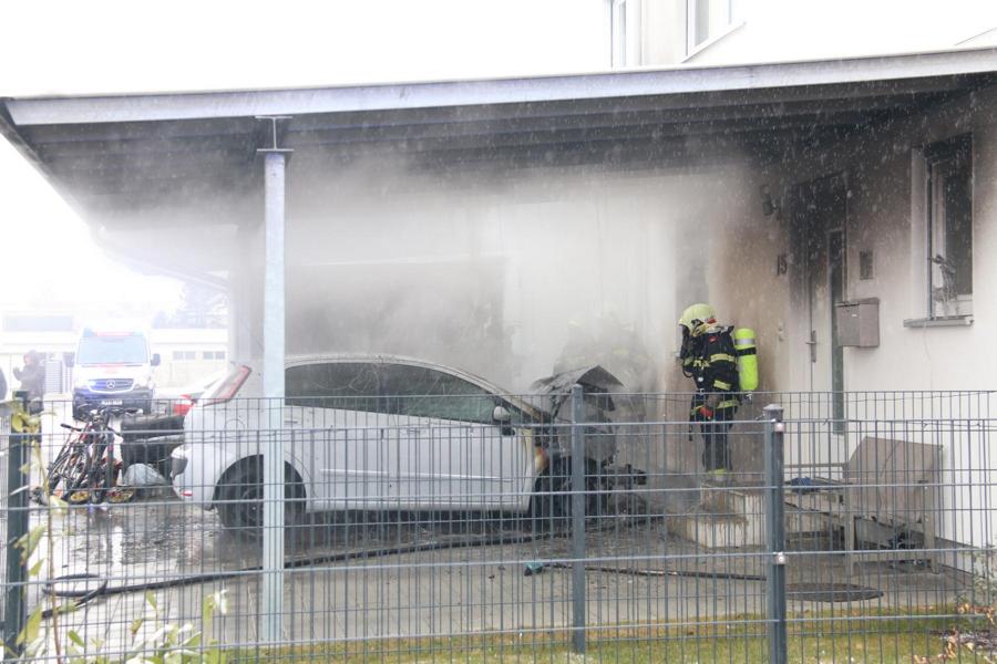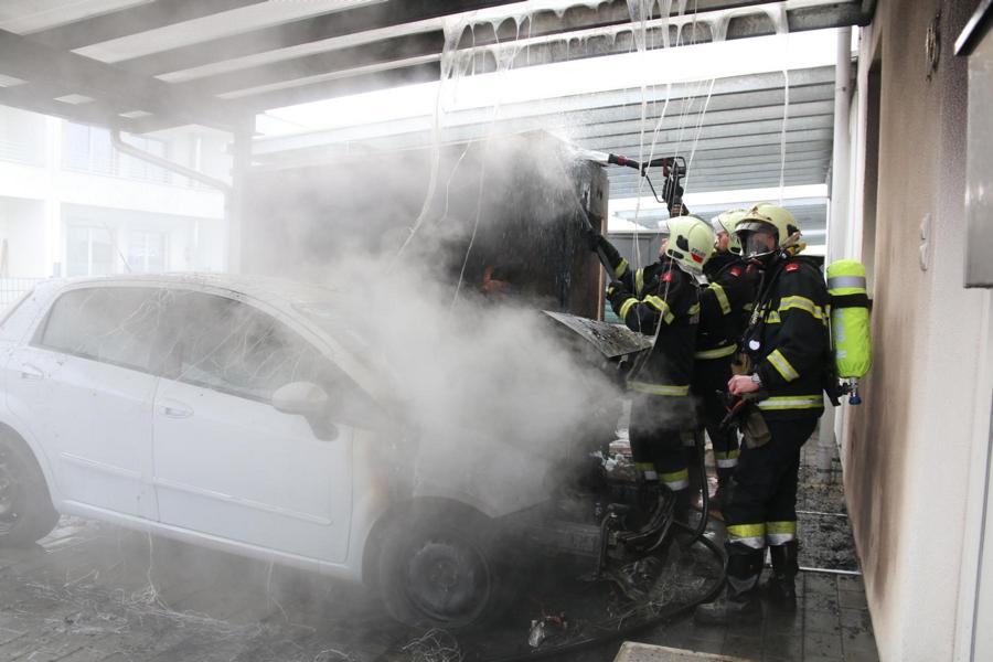 Gleich mehrere Notrufe trafen um kurz vor halb elf Uhr vormittags am ersten Sonntag im neuen Jahr in der Bezirksalarmzentrale ein. Unter einem Carport brennt ein Fahrzeug. Nachbarn begannen sofort mit Handfeuerlöschern mit den ersten Löschversuchen und konnten das Feuer zumindest so weit eindämmen, dass das Feuer auf das Haus nicht übergreifen konnte.