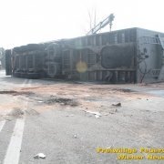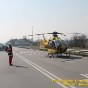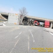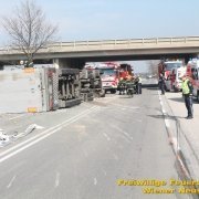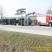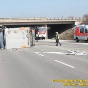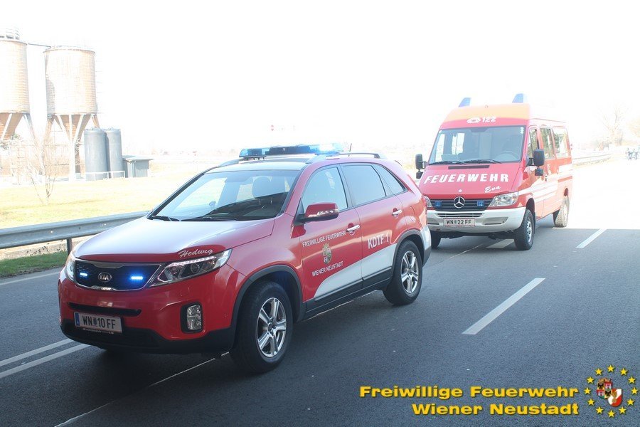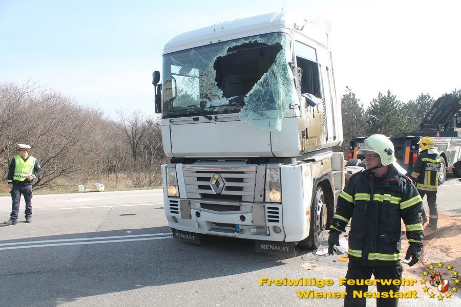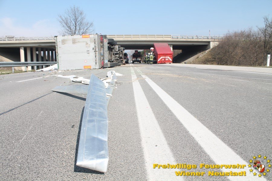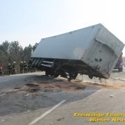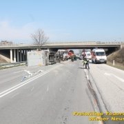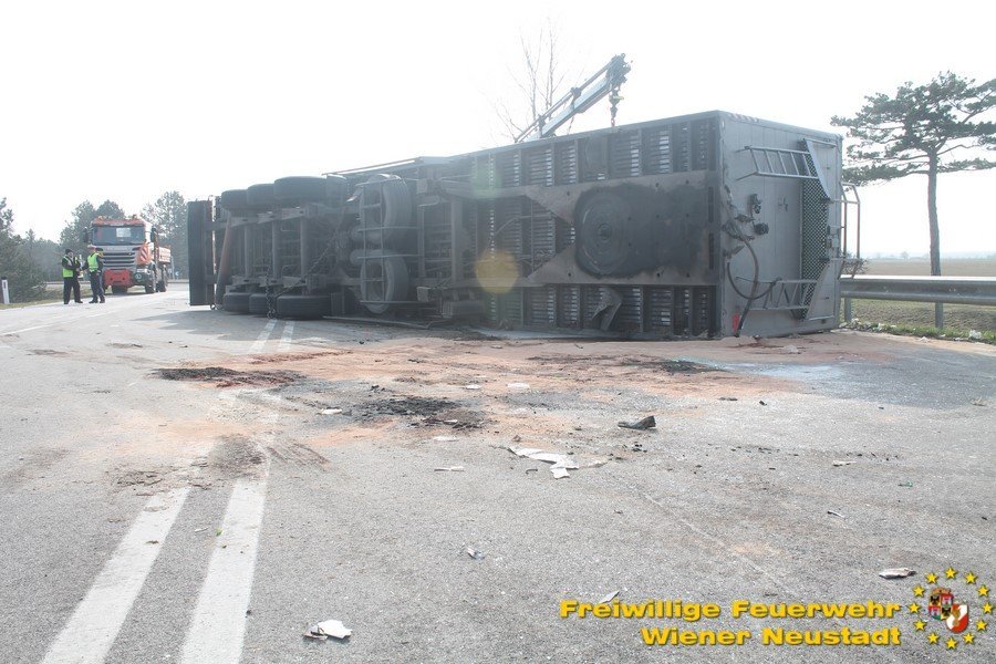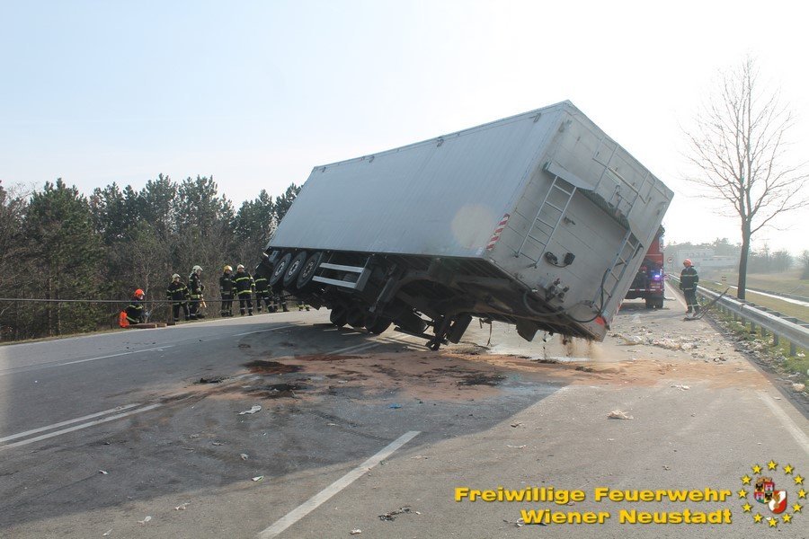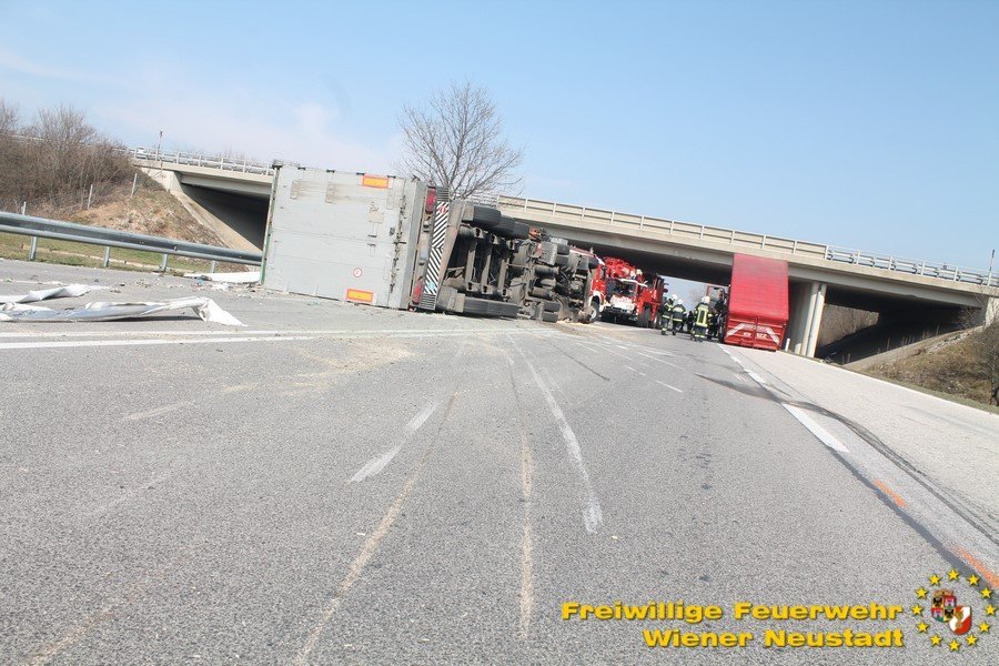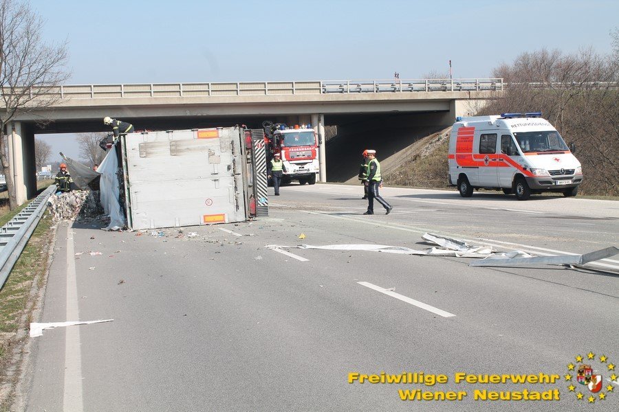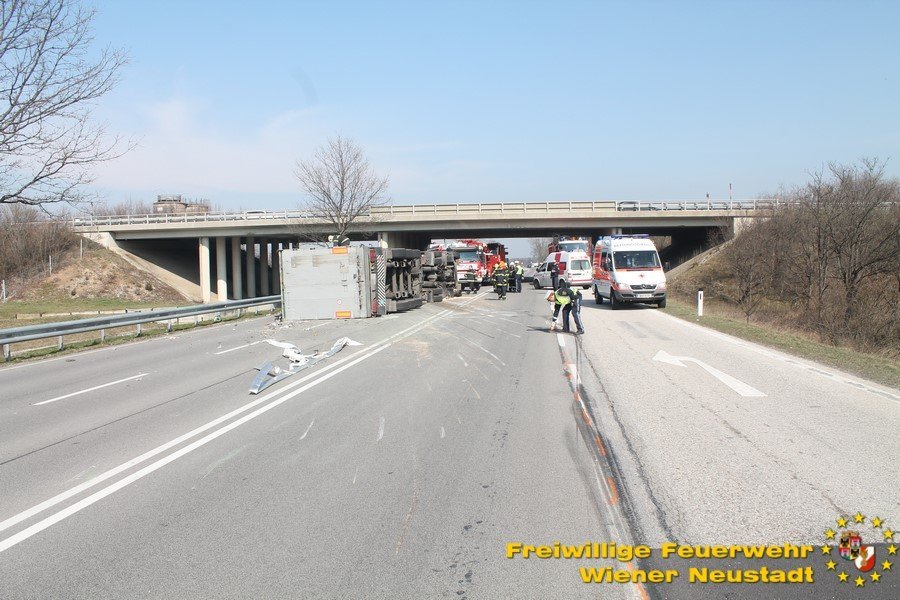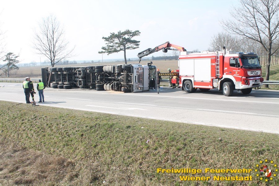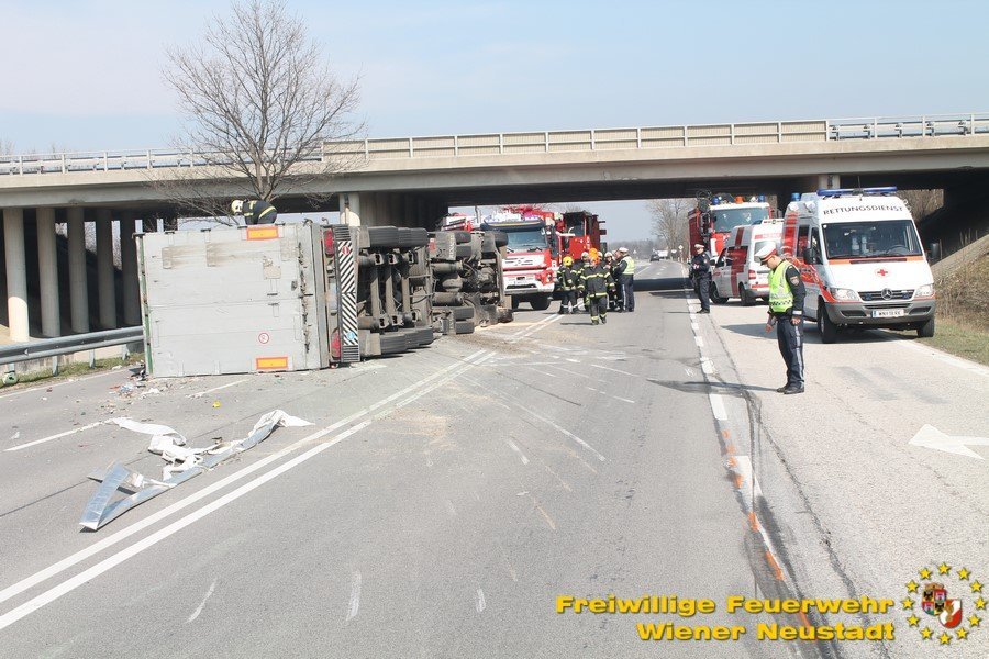Zur Stunde befinden sich etwa zwei Dutzend Einsatzkräfte der Feuerwehr Wiener Neustadt auf der B54 bei Wiener Neustadt nach einem schweren Verkehrsunfall im Einsatz. Ein Lkw war bei der Abfahrt von der S4 auf der B54 ins Schleudern geraten und umgekippt. Die beiden Insassen wurden unbestimmten Grades verletzt. Die Beifahrerin musste mit dem Notarzthubschrauber ins Krankenhaus geflogen werden. Die Bergung dauert momentan noch an.