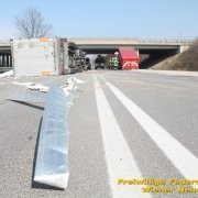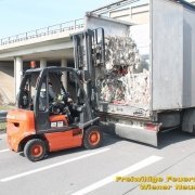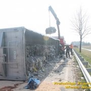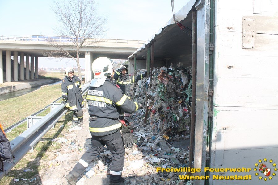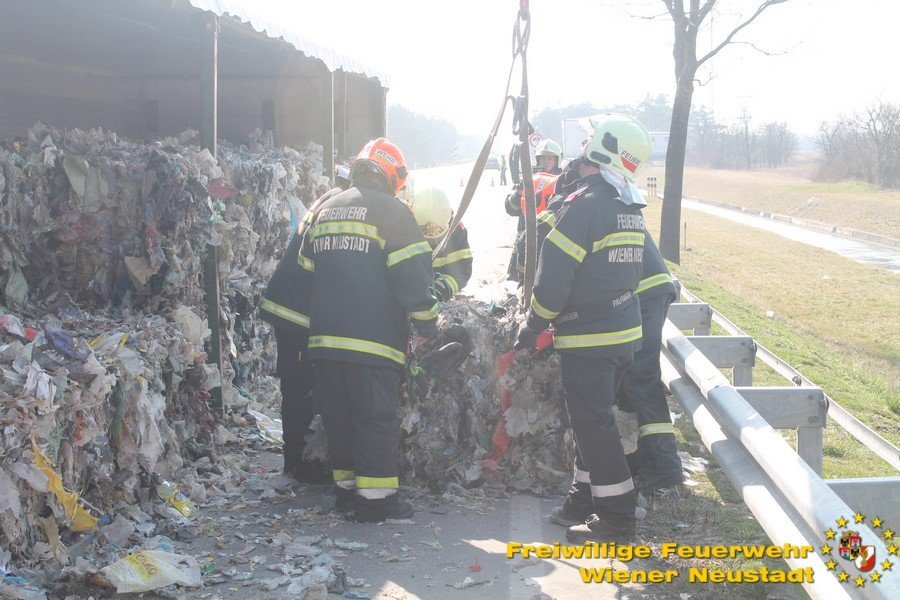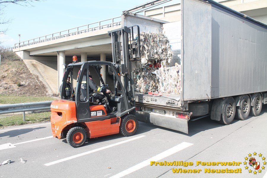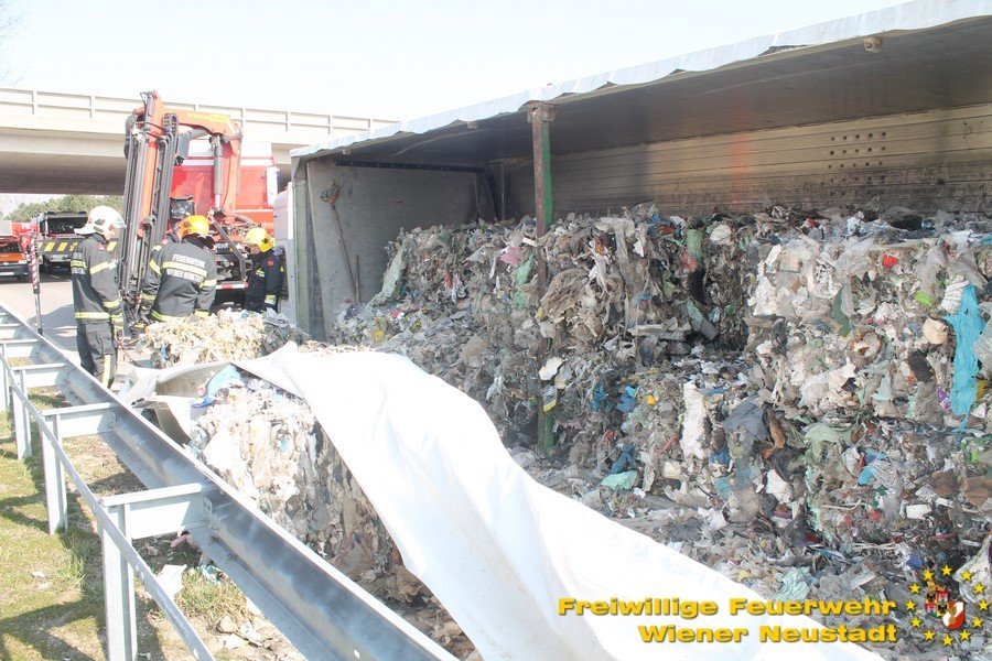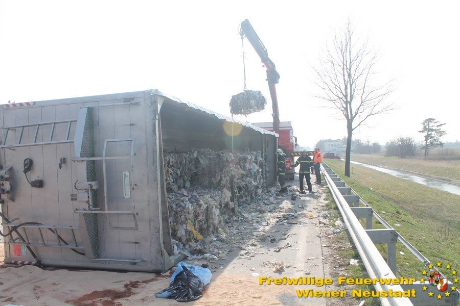 Um den Sattelzug zu bergen, musste erst die Ladung entfernt werden. Dabei unterstützte uns der Bauhof der Gemeinde Wiener Neustadt mit zwei Lkws. Danach wurde der Sattelaufleger aufgerichtet und abtransportiert. Den Abtransport übernahm ein Privatunternehmen.