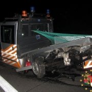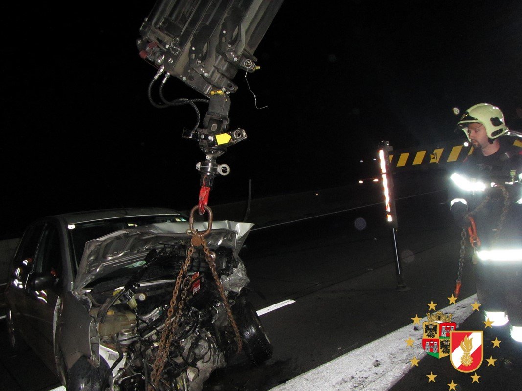 Kurz nachdem die Feuerwehr eingerückt war traf der nächste Notruf ein. Aus bislang ungeklärter Ursache fuhr ein weißer Peugeot auf den Pritschen-Wagen der ASFINAG auf, welcher die erste Spur sperrte, und versetzte dem Fahrzeug einen derartigen Impuls, dass der Klein-Lkw auf der dritten Spur zum Stehen kam. Nur durch Glück traf der Pritschenwagen nicht den Polizeiwagen, in welchem die Beamten saßen und noch mit der Aufnahme des ersten Unfalles zu tun hatten. Die Feuerwehr rückte wieder an und zog zuerst den Pritschenwagen auf den Pannenstreifen um so rasch als möglich die dritte Spur wieder zu öffnen. Der völlig deformierte Pkw wurde mit dem Galgen des schweren Rüstfahrzeuges gesichert neben die zwei anderen Fahrzeuge vom ersten Unfall auf einem Parkplatz abgestellt. Der Pritschenwagen wurde von einem privaten Abschleppunternehmen abgeschleppt.
