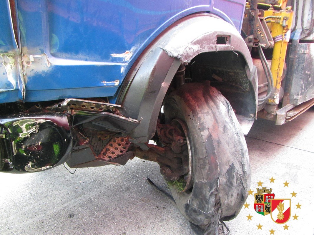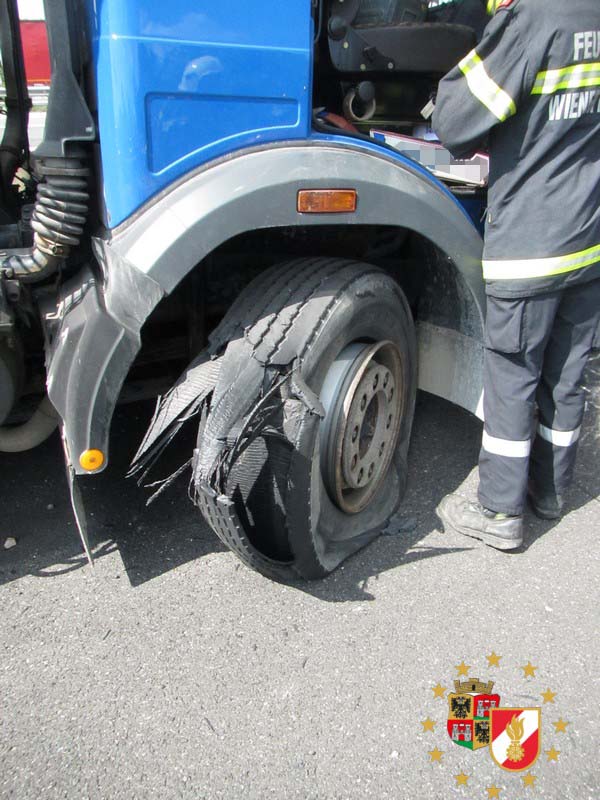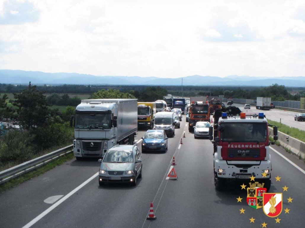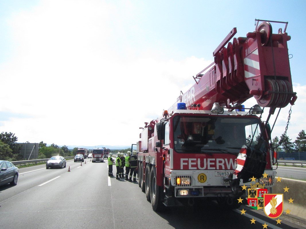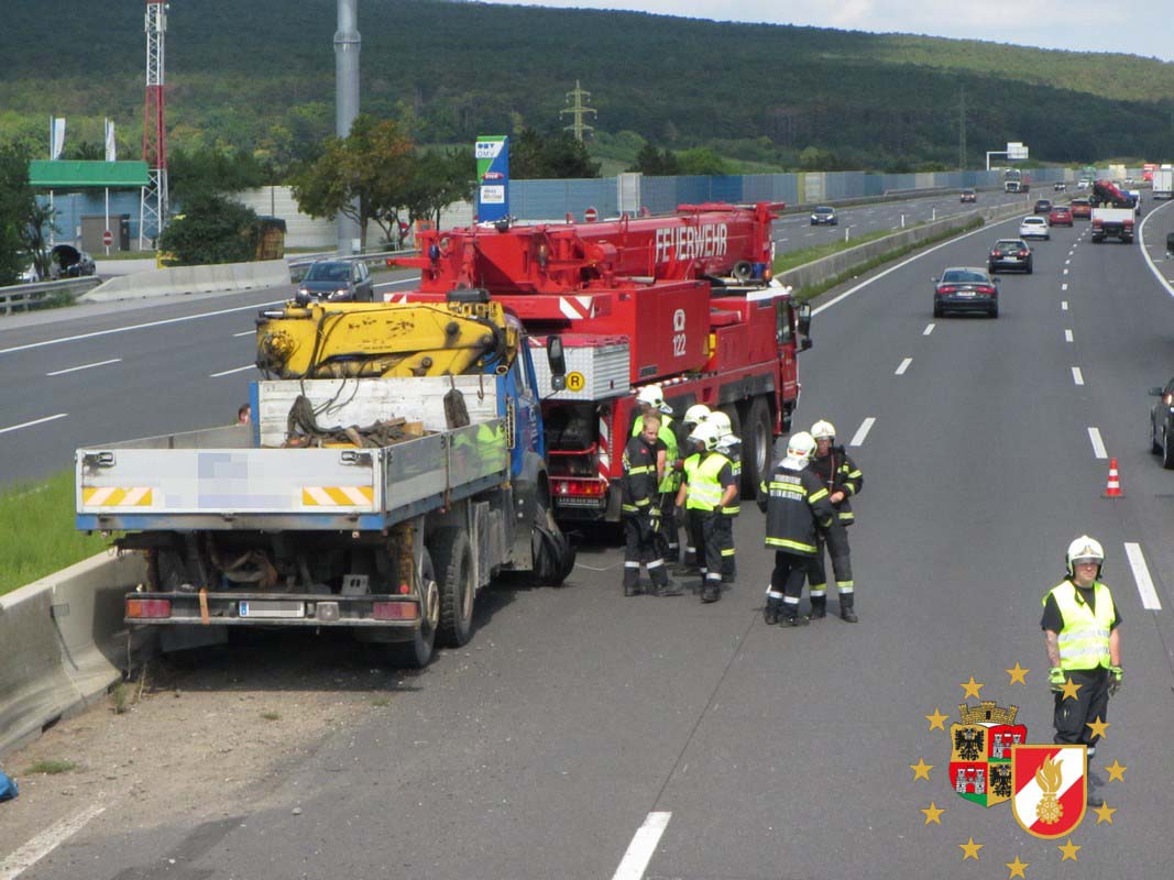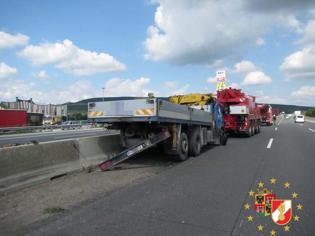 Ein Lkw touchierte aus bislang unbekannter Ursache die Mittelleitwand aus Beton und versperrte die Fahrbahn. Die Feuerwehr barg den Lkw und stellte diesen am Rastplatz Föhrenberg ab.