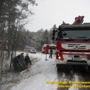 Kurz, nachdem die eingesetzten Kräfte wieder in der Feuerwehrzentrale eingetroffen waren, meldete die Polizei einen Verkehrsunfall auf der B54 Fahrtrichtung Bad Erlach. Ein Pkw mit drei Insassen schleuderte seitlich in den Straßengraben, wo das Auto auf der Seite liegen blieb. Alle drei Insassen wurden vom Rettungsdienst versorgt und ins Krankenhaus gebracht. Die Feuerwehr Wiener Neustadt sicherte die Unfallstelle ab und führte anschließend die Fahrzeugbergung durch.