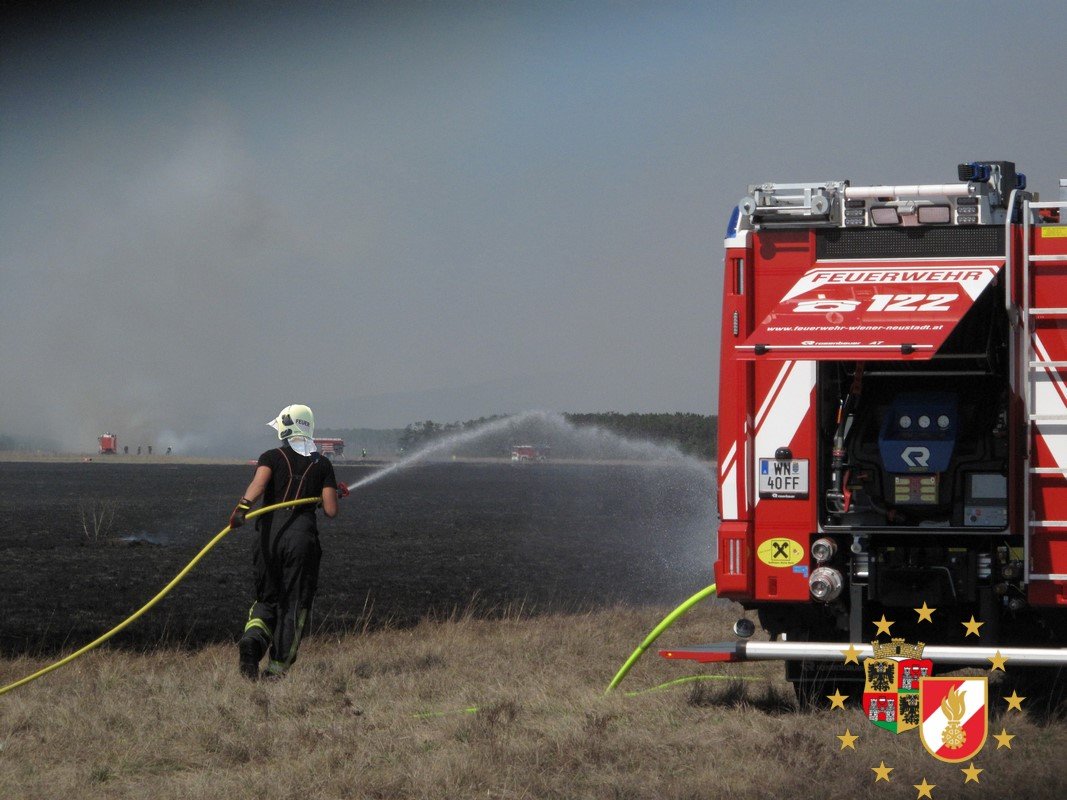 Sofort wurde die Freiwillige Feuerwehr Wiener Neustadt mit zwei Großtanklöschfahrzeugen zur Unterstützung entsendet. Bereits bei der Anfahrt erkannten Einsatzleiter Branddirektor Josef Bugnar und sein Stellvertreter Brandrat Christian Pfeiffer, dass der Wind das Feuer direkt auf den nahen Föhrenwald zutrieb und die Flammen sich in Bodennähe rasant ausbreiteten. Bugnar ließ auf die Alarmstufe B4 erhöhen, was einen Vollalarm mit Sirene der Feuerwehr Wiener Neustadt bedeutete. Zusätzlich wurden zur Flugfeldkaserne auch die Feuerwehren Felixdorf, Katzelsdorf, Matzendorf, Sollenau, Steinabrückl und Theresienfeld alarmiert. Die Freiwillige Feuerwehr Katzelsdorf übernahm mit einem Rüstlöschfahrzeug und sieben Feuerwehrmitgliedern gemeinsam mit weiteren acht Feuerwehrmännern der Feuerwehr Wiener Neustadt die Einsatzbereitschaft für weitere Einsätze im Wiener Neustädter Stadtgebiet.