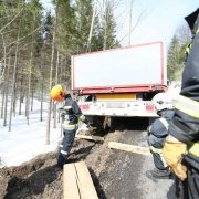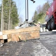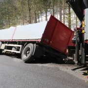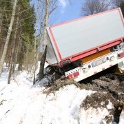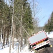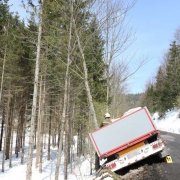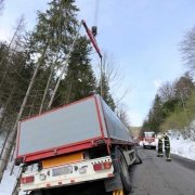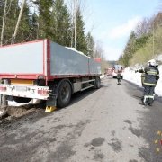 Ein Lkw mit vollgeladenem Anhänger fuhr am Hals in Pernitz an einem stehenden Schneepflug vorbei. Dabei rutschte der Hänger am aufgeweichten Bankette ab und grub sich ein. Das Zugfahrzeug blieb ebenfalls mit dem linken hinteren Zwillingsreifen stecken.