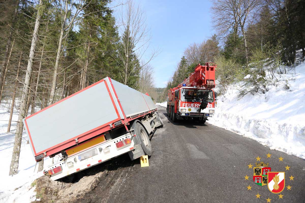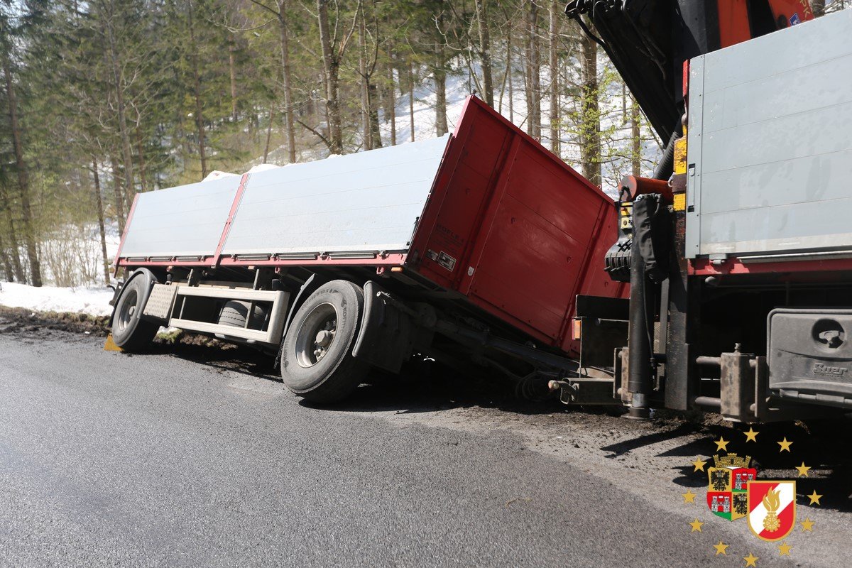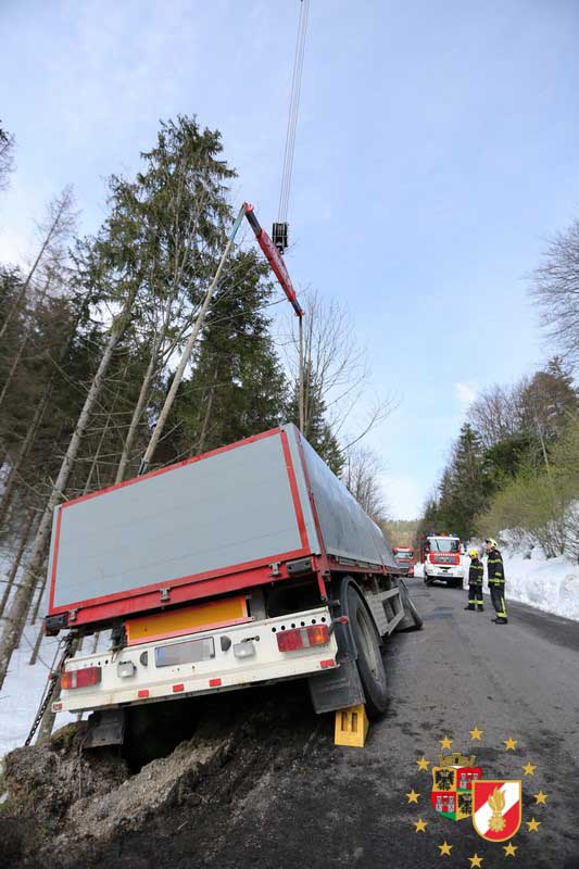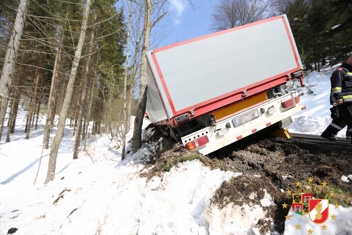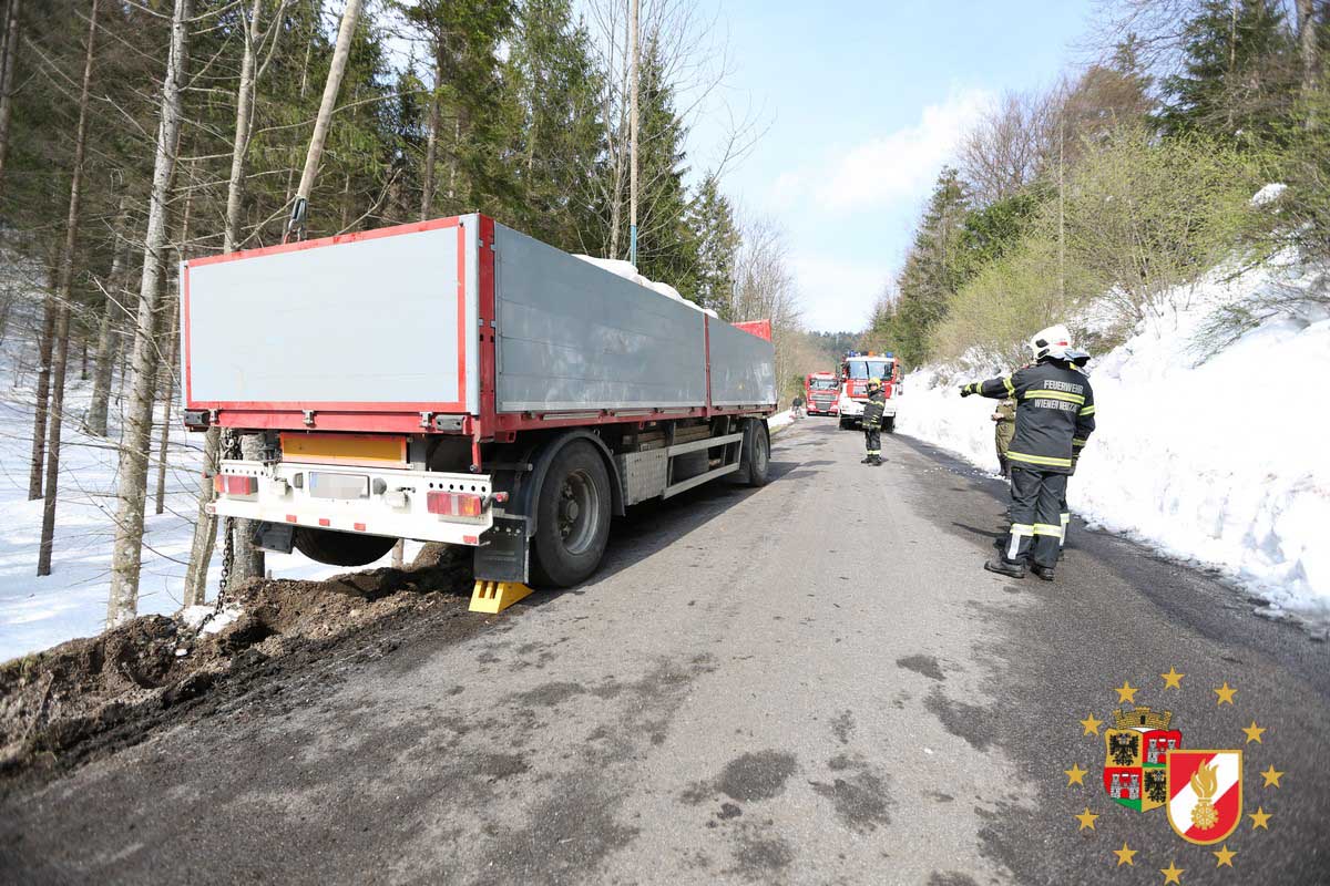 Ein Lkw mit vollgeladenem Anhänger fuhr am Hals in Pernitz an einem stehenden Schneepflug vorbei. Dabei rutschte der Hänger am aufgeweichten Bankette ab und grub sich ein. Das Zugfahrzeug blieb ebenfalls mit dem linken hinteren Zwillingsreifen stecken.