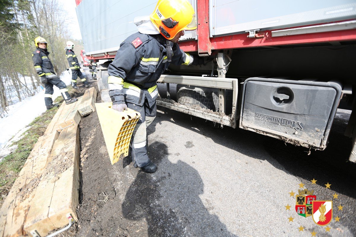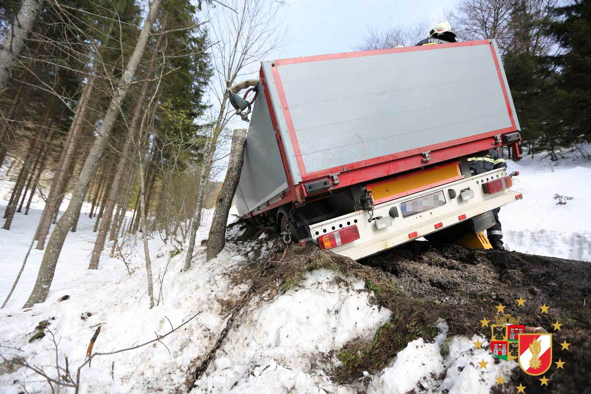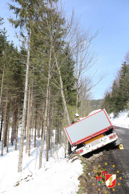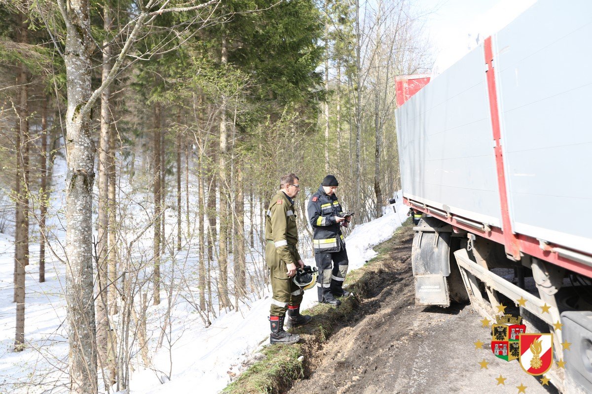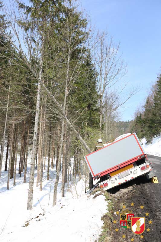 Ein Lkw mit vollgeladenem Anhänger fuhr am Hals in Pernitz an einem stehenden Schneepflug vorbei. Dabei rutschte der Hänger am aufgeweichten Bankette ab und grub sich ein. Das Zugfahrzeug blieb ebenfalls mit dem linken hinteren Zwillingsreifen stecken.