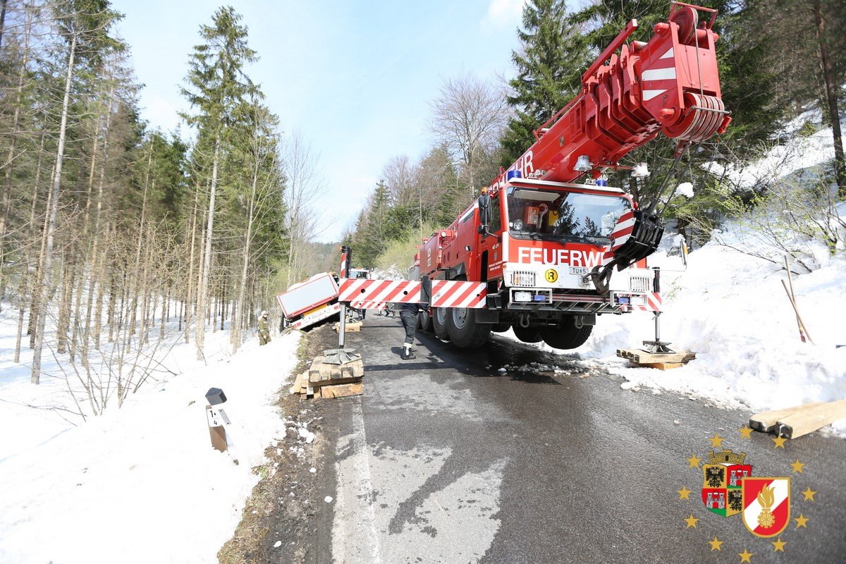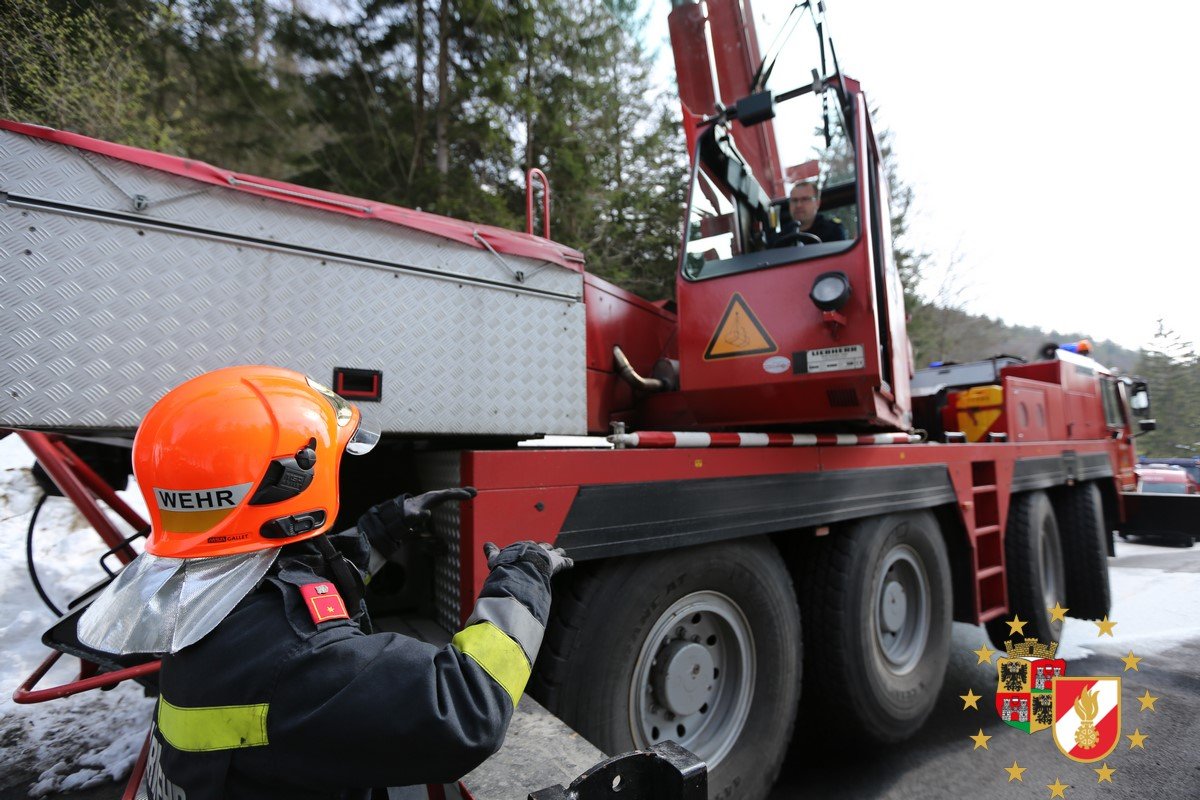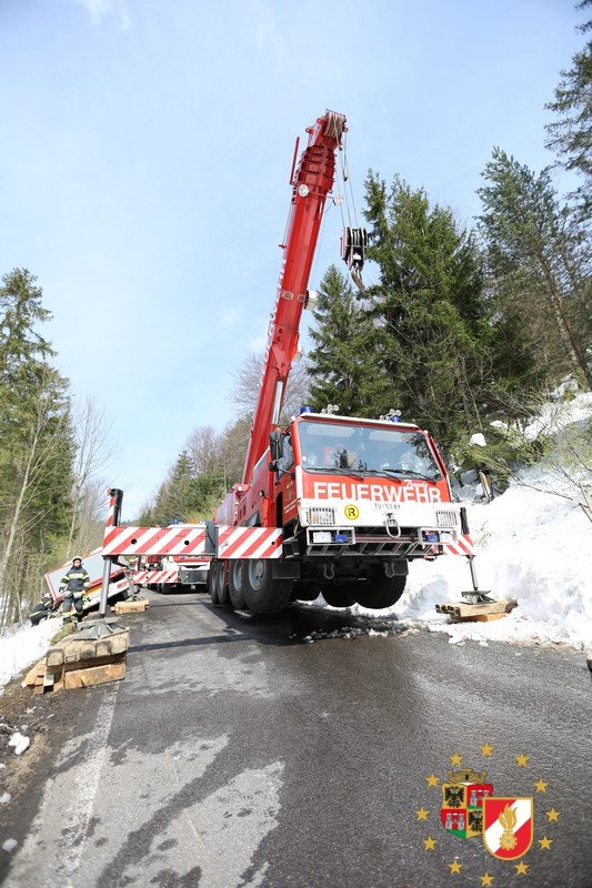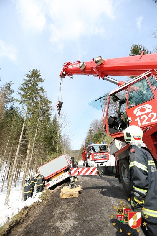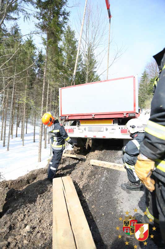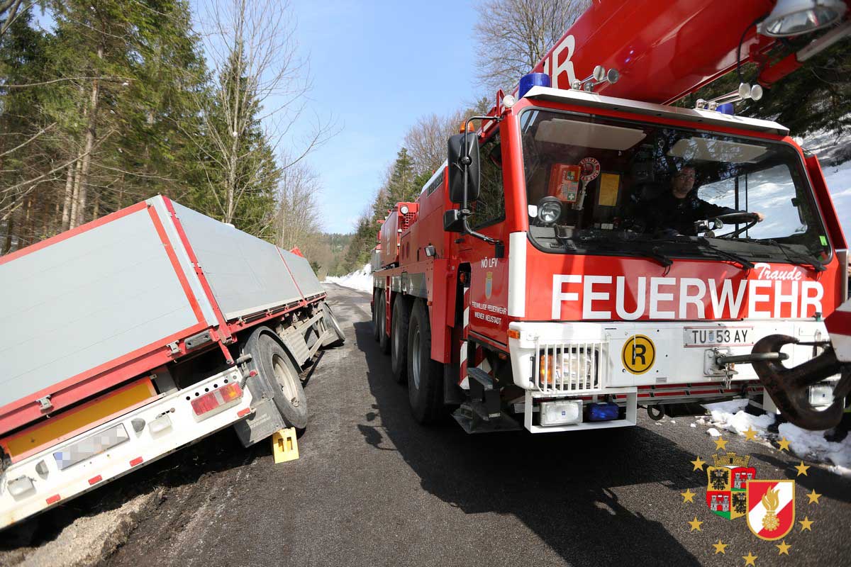 Die Feuerwehr Pernitz barg das Zugfahrzeug mittels Abschleppstange mit dem Tanklöschfahrzeug. Für den Anhänger wurde das Kranfahrzeug aus Wiener Neustadt angefordert.