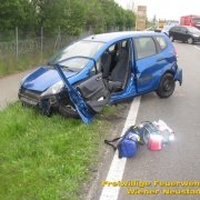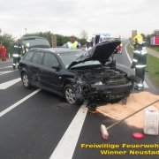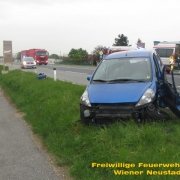 Die Feuerwehr Wiener Neustadt rückte nach einer Meldung von 144 Notruf Niederösterreich kurz nach dem Alarm mit drei Fahrzeugen aus. Beim Eintreffen der Feuerwehr begann der eingetroffene Rettungsdienst unter Leitung des Hubschraubernotarztes gerade mit der Sichtung der Verletzten. Die eingeklemmte Frau konnte zwar über die Beifahrerseite erstversorgt werden, zur Rettung aus dem Fahrzeug musste von der Feuerwehr jedoch die verformte Fahrertüre mittels hydraulischem Rettungsgerät entfernt werden. Danach konnte die Fahrerin an die Crew des Christophorus 3 übergeben werden. Sie wurde schwer verletzt in den Schockraum des LKH Wiener Neustadt geflogen.