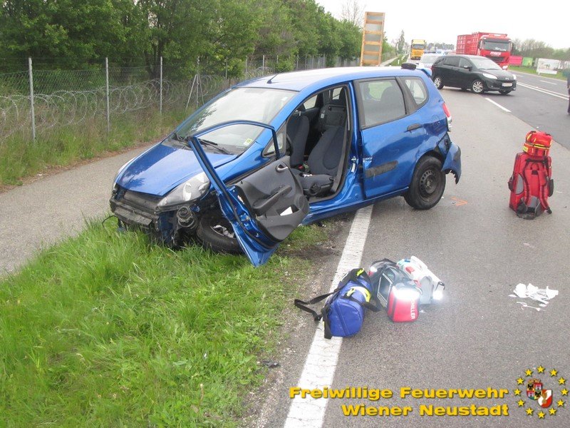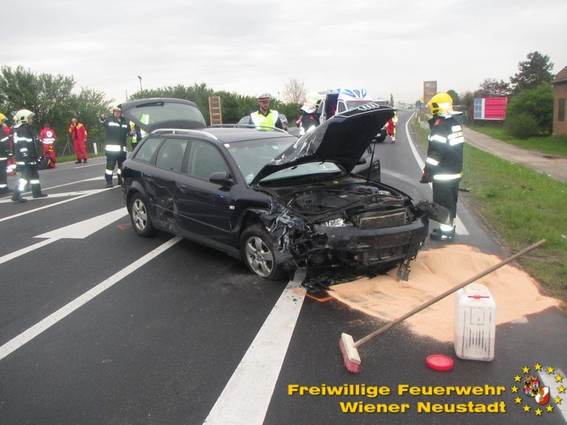 Auf Höhe der Autobahnabfahrt in Fahrtrichtung Zentrum Wiener Neustadt kam es am heutigen Mittwoch, 03.05., gegen 14.15 Uhr zu der Kollision. Aus unbekannter Ursache kollidierten die beiden unfallbeteiligten Fahrzeuge frontal miteinander. Der Honda mit Badener Kennzeichen wurde durch die Wucht des Aufpralls so sehr verformt, dass die Lenkerin im Fahrzeug eingeklemmt und schwer verletzt wurde. Auch das andere Fahrzeug, ein Audi mit Neunkirchner Kennzeichen, wurde schwer beschädigt und die beiden Insassen unbestimmten Grades verletzt.