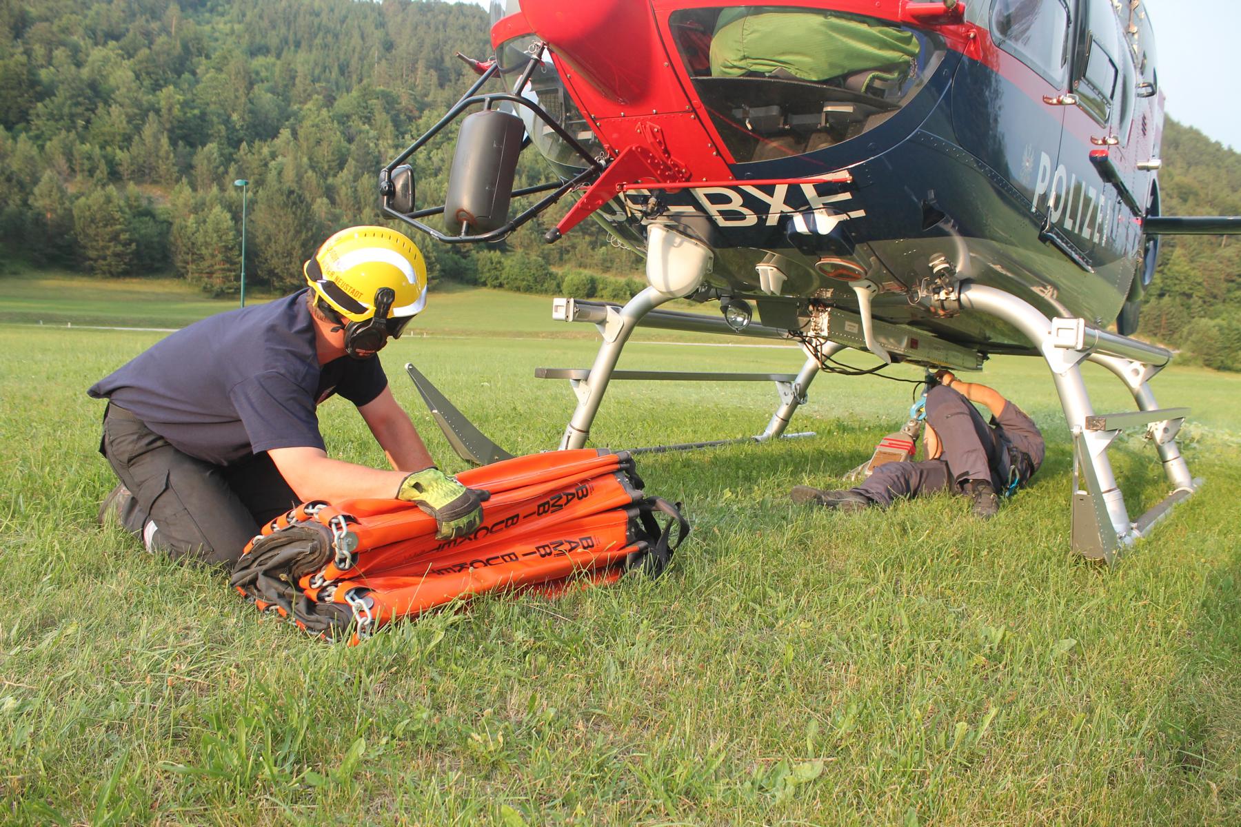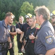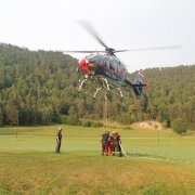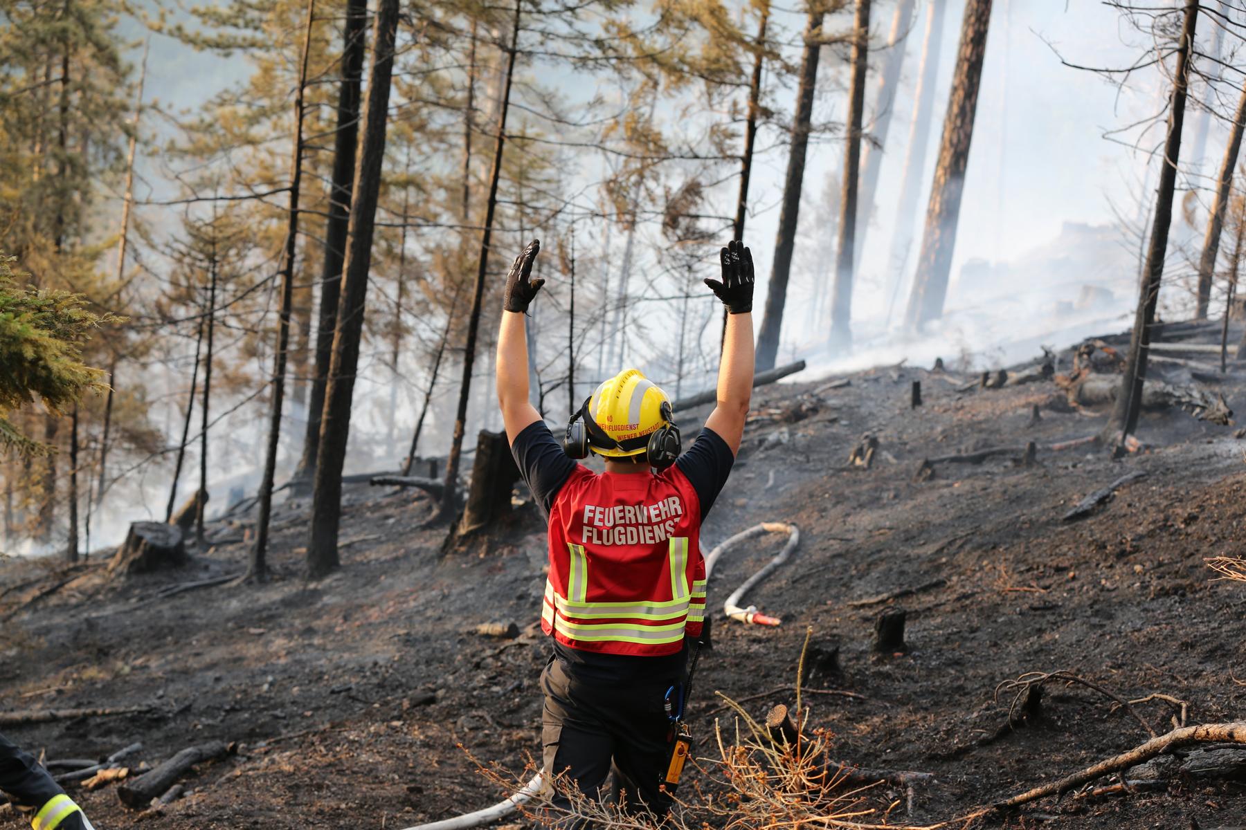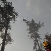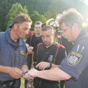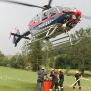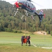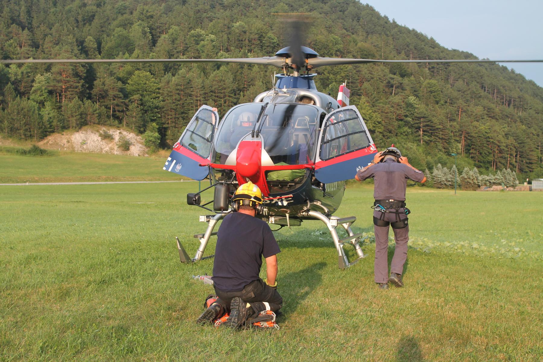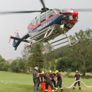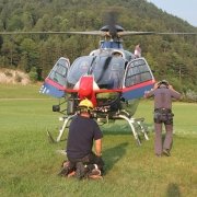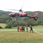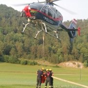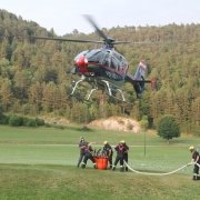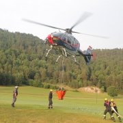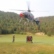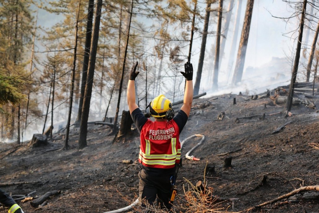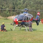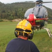 Sofort wurde mit dem örtlichen Feuerwehreinsatzleiter Kontakt aufgenommen. Flugdienst Gruppenkommandant Alfred Grimm fuhr mit zwei Flughelfern direkt in den Waldbrandbereich, während sein Stellvertreter Norbert Schmidtberger die Koordination am Landeplatz, einer Wiese neben dem Feuerwehrhaus Muggendorf, übernahm.