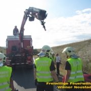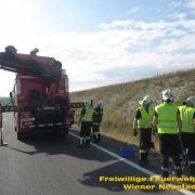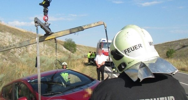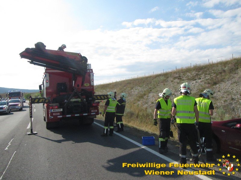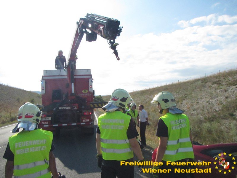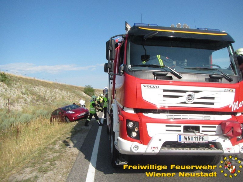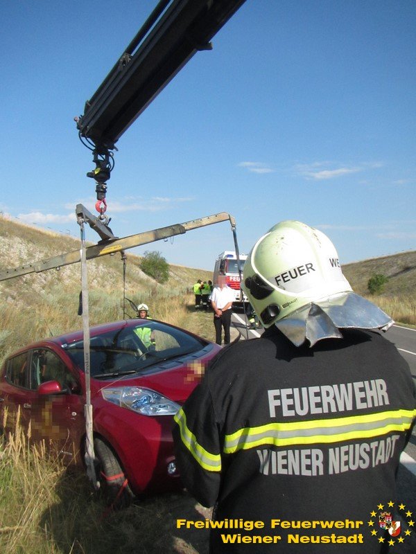 Erneut zu einem Pkw im Graben rückte die Feuerwehr Wiener Neustadt aus. Am Samstag, 05.08., landete ein Elektroauto auf der Nordspange im Straßengraben. Die Feuerwehren Wiener Neustadt und Theresienfeld rückten zur Unfallstelle aus. Die Feuerwehr Wiener Neustadt stellte das Auto mittels Kran und Hebekreuz wieder auf die Fahrbahn. Das E- Auto konnte die Fahrt dann selbstständig fortsetzten.