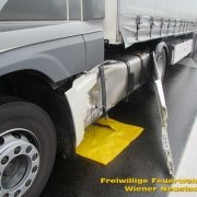 Die erste Stelle bildete der Lkw mit dem aufgerissenen Dieseltank. Hier wurde durch die Mannschaft des Vorausrüstfahrzeugs und des – durch den präzisen Notruf bereits in der ersten Welle ausgerückten – Versorgungsfahrzeuges mit mehreren Säcken Ölbindemittel die Dieselspur gebunden und der Tank abgepumpt.