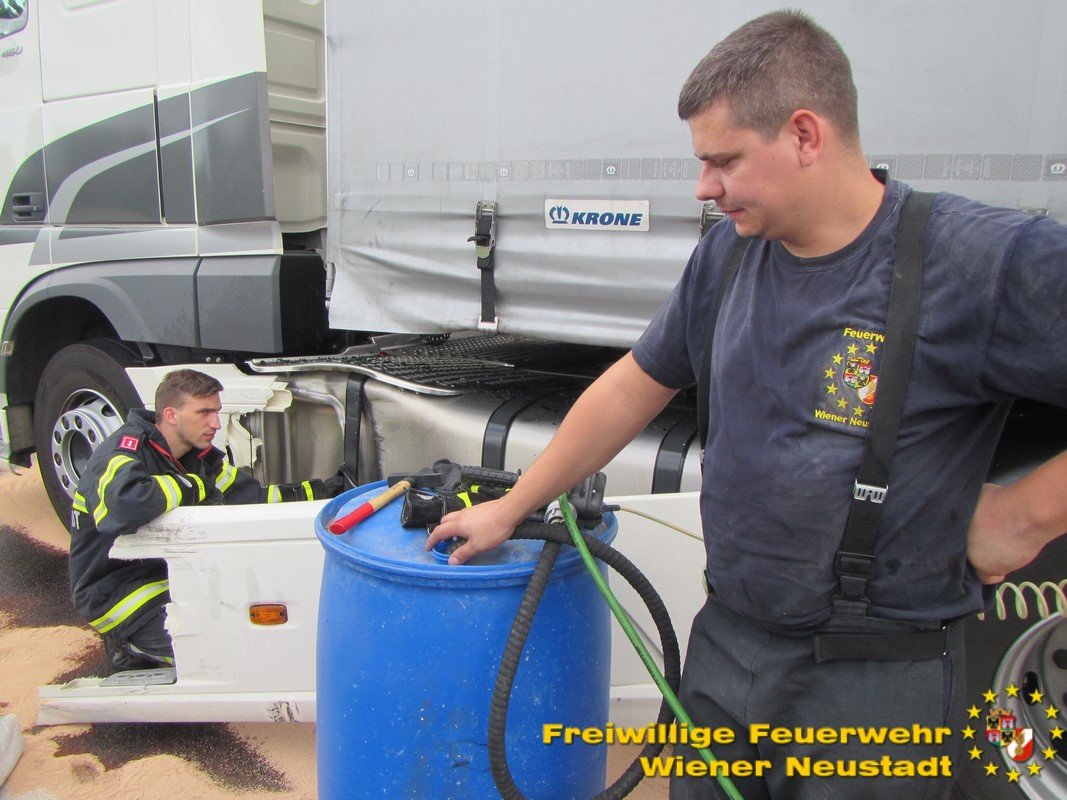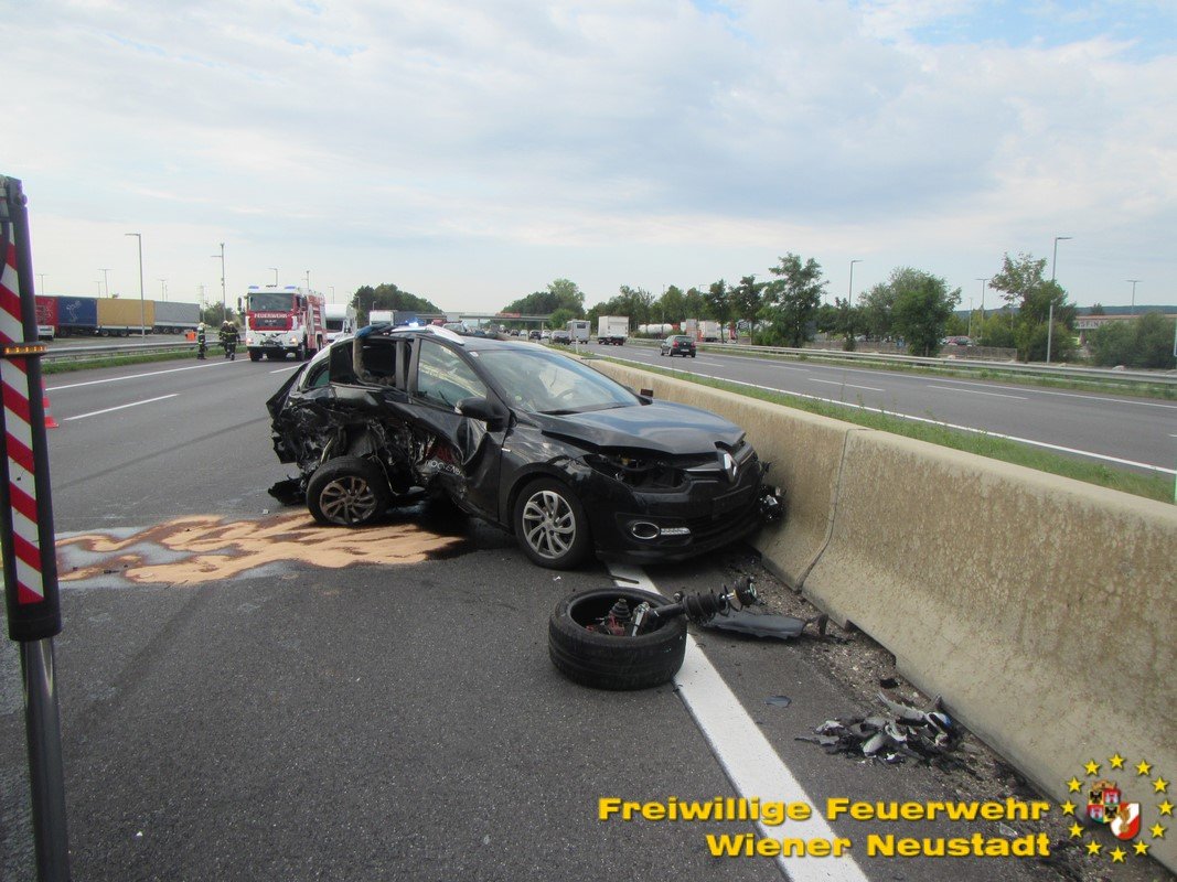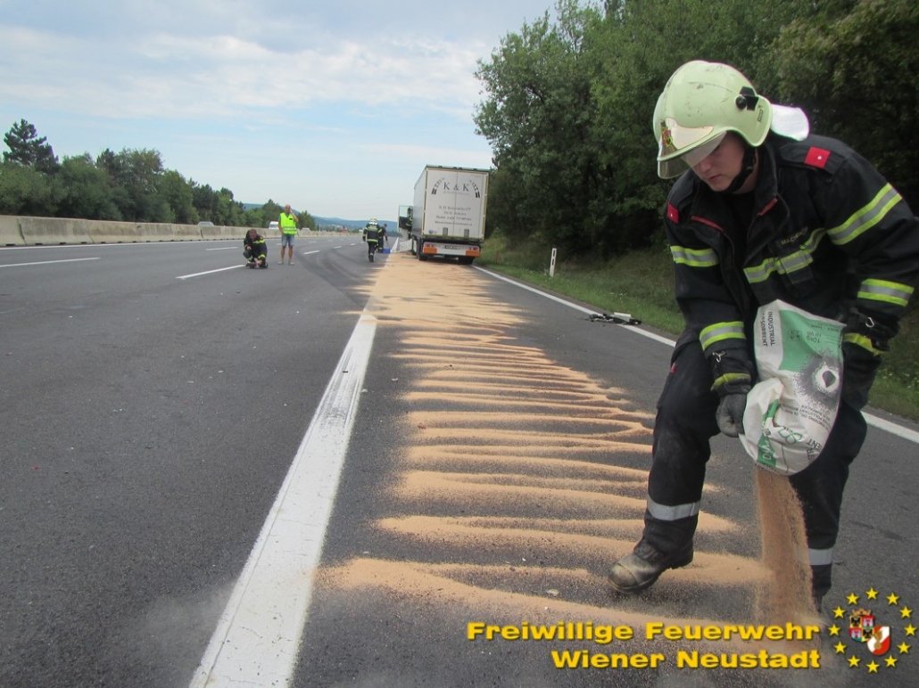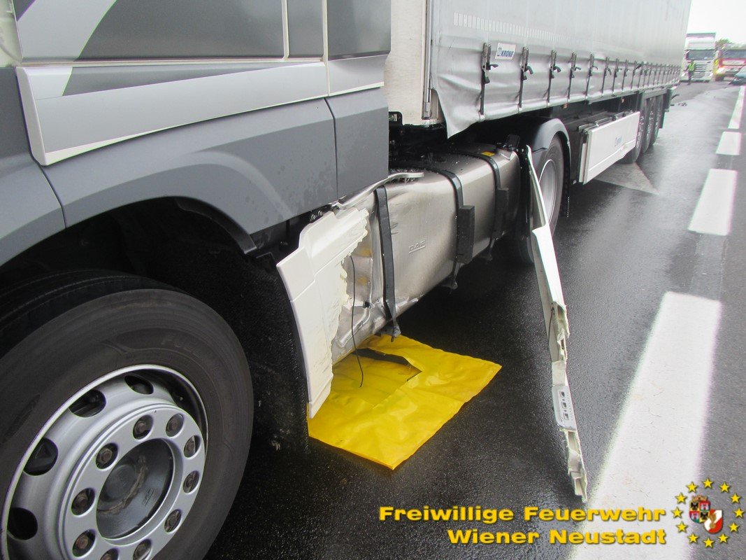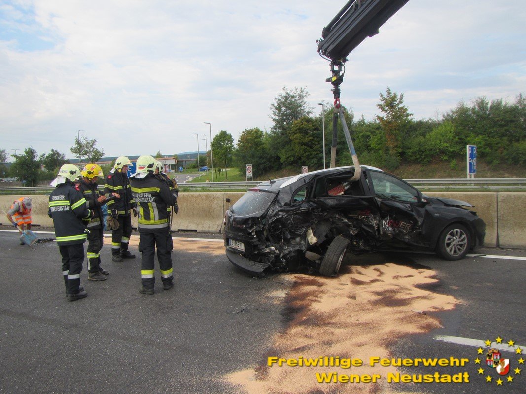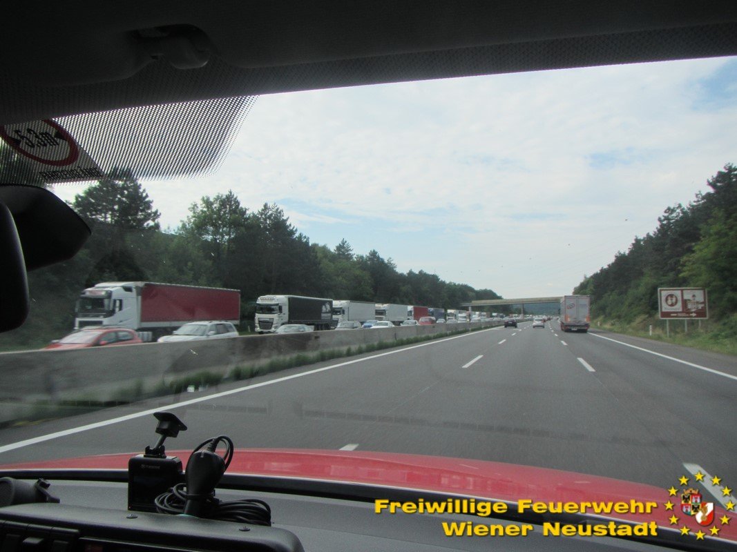 Zu einem schweren Unfall wurde die Freiwillige Feuerwehr Wiener Neustadt um kurz vor halb neun Uhr morgens am Freitag, 25. August 2017, alarmiert. Mehrere Pkw und ein Lkw in einen Unfall auf der A2 Südautobahn Höhe Rastplatz Leobersdorf verwickelt, so die Meldung über den Notruf 122. Aus dem Lkw trat eine große Menge Diesel aus. Sofort wurde ein Fahrzeug mit der im Feuerwehrhaus anwesenden Mannschaft der Freiwilligen Feuerwehr Wiener Neustadt in Bewegung gesetzt und zeitgleich über Pager alarmiert.