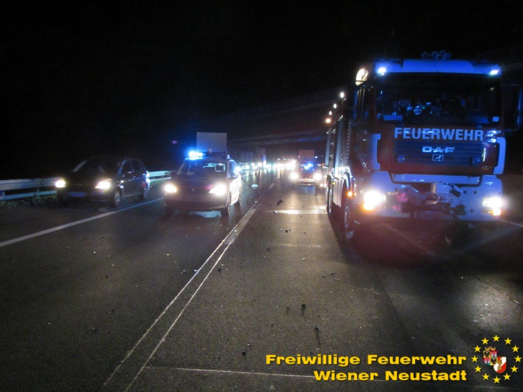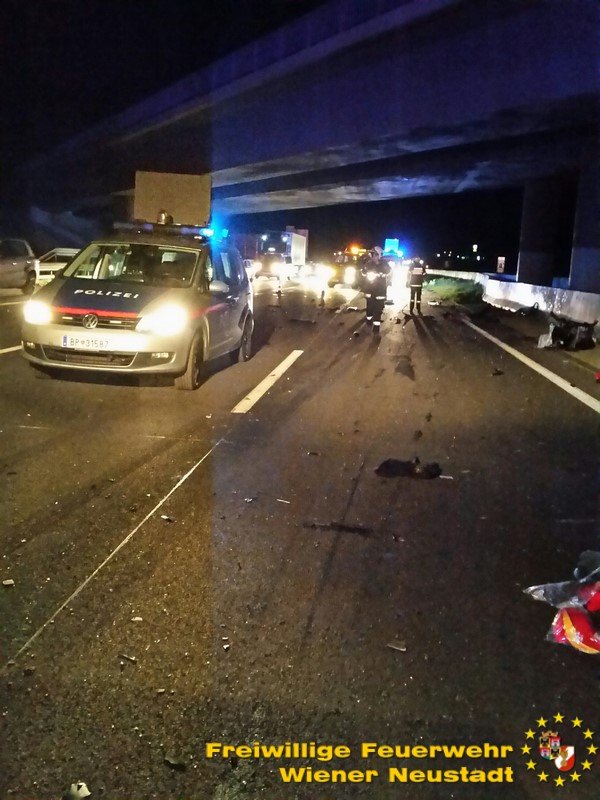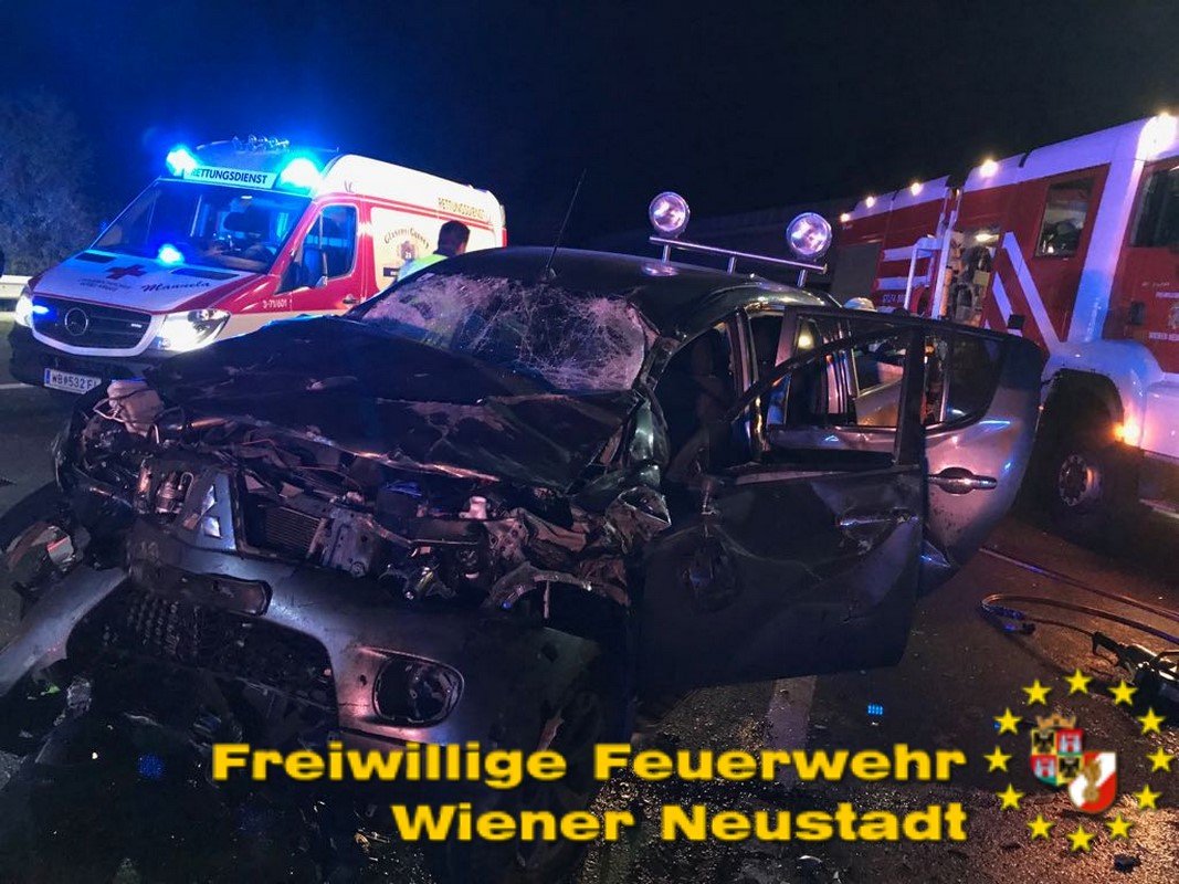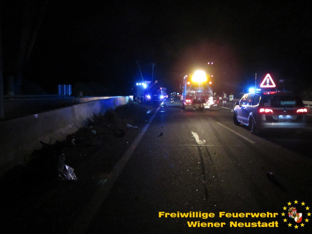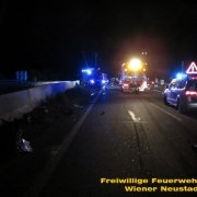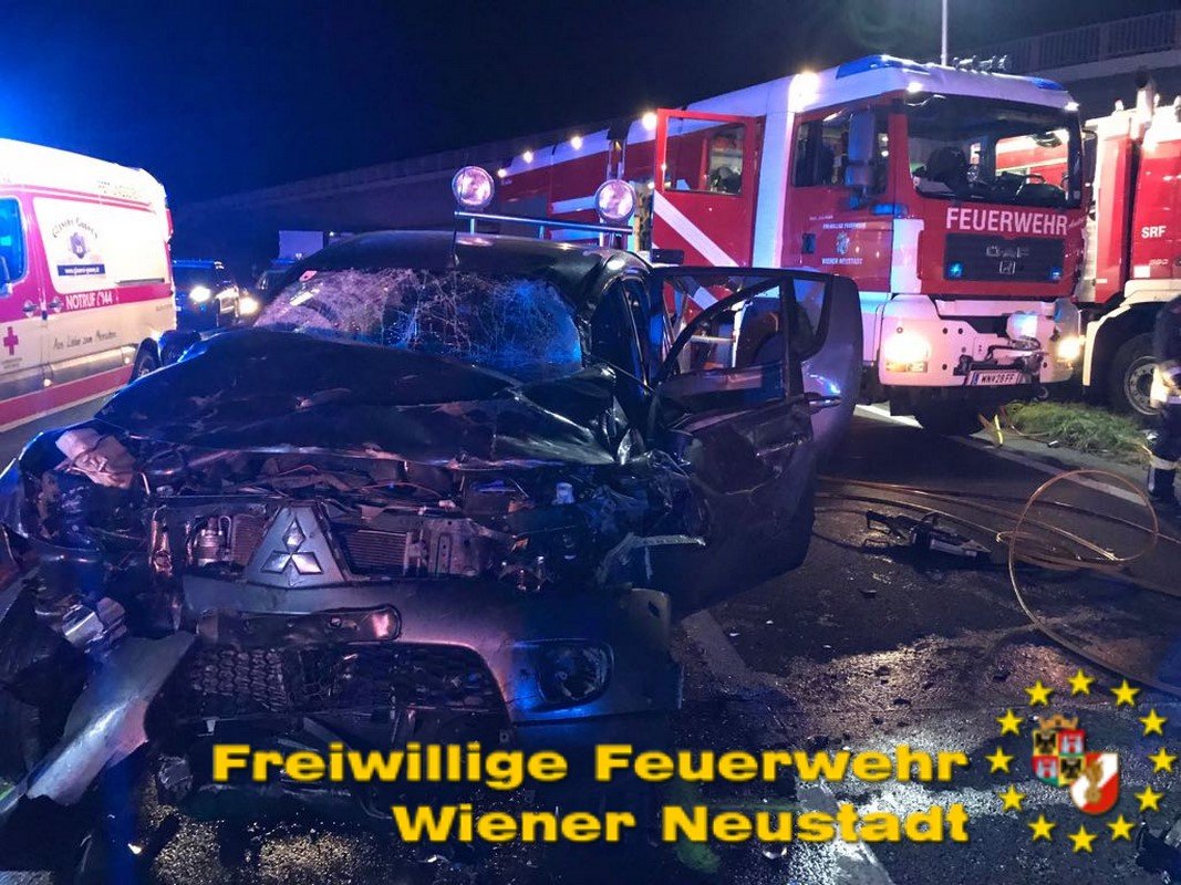 Zu einem schweren Verkehrsunfall mit einer eingeklemmten Person wurde die Freiwillige Feuerwehr Wiener Neustadt in der Nacht zum Freitag auf die A2 Südautobahn alarmiert. Ein Pkw-Lenker verlor bei dem Unfall sein Leben. Ein weiterer wurde vom Rettungsdienst mit Verletzungen unbestimmten Grades in das Landesklinikum Wiener Neustadt gebracht.