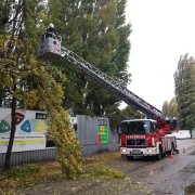 Neben einer umgestürzten Plakatwand beschäftigte die Einsatzkräfte am Vormittag ein umgestürzter Baum in der Giltschwertgasse. Hier stand die Drehleiter im Einsatz, um einen gebrochen Ast zu entfernen, der die Straße blockierte und eine Gefahr für den Verkehr darstellte.