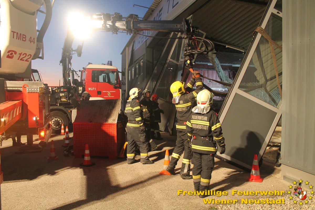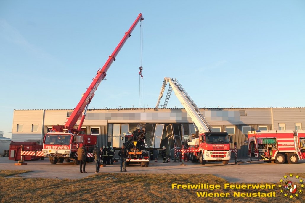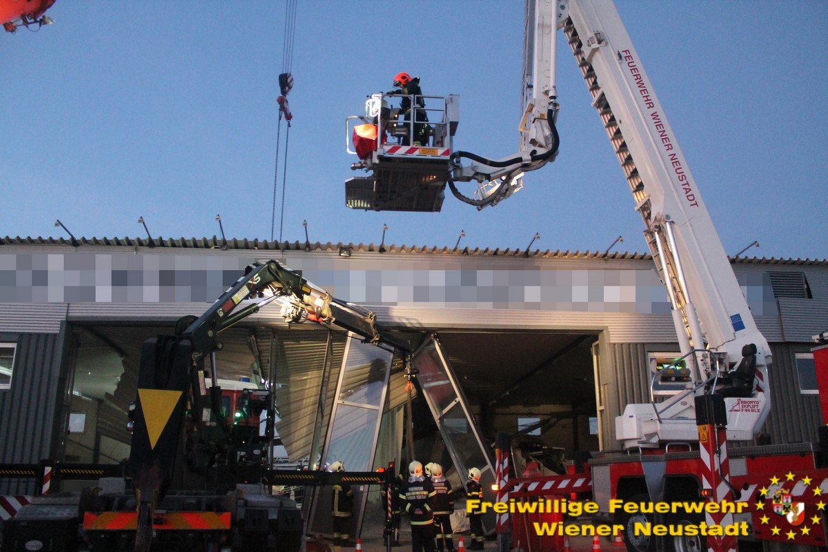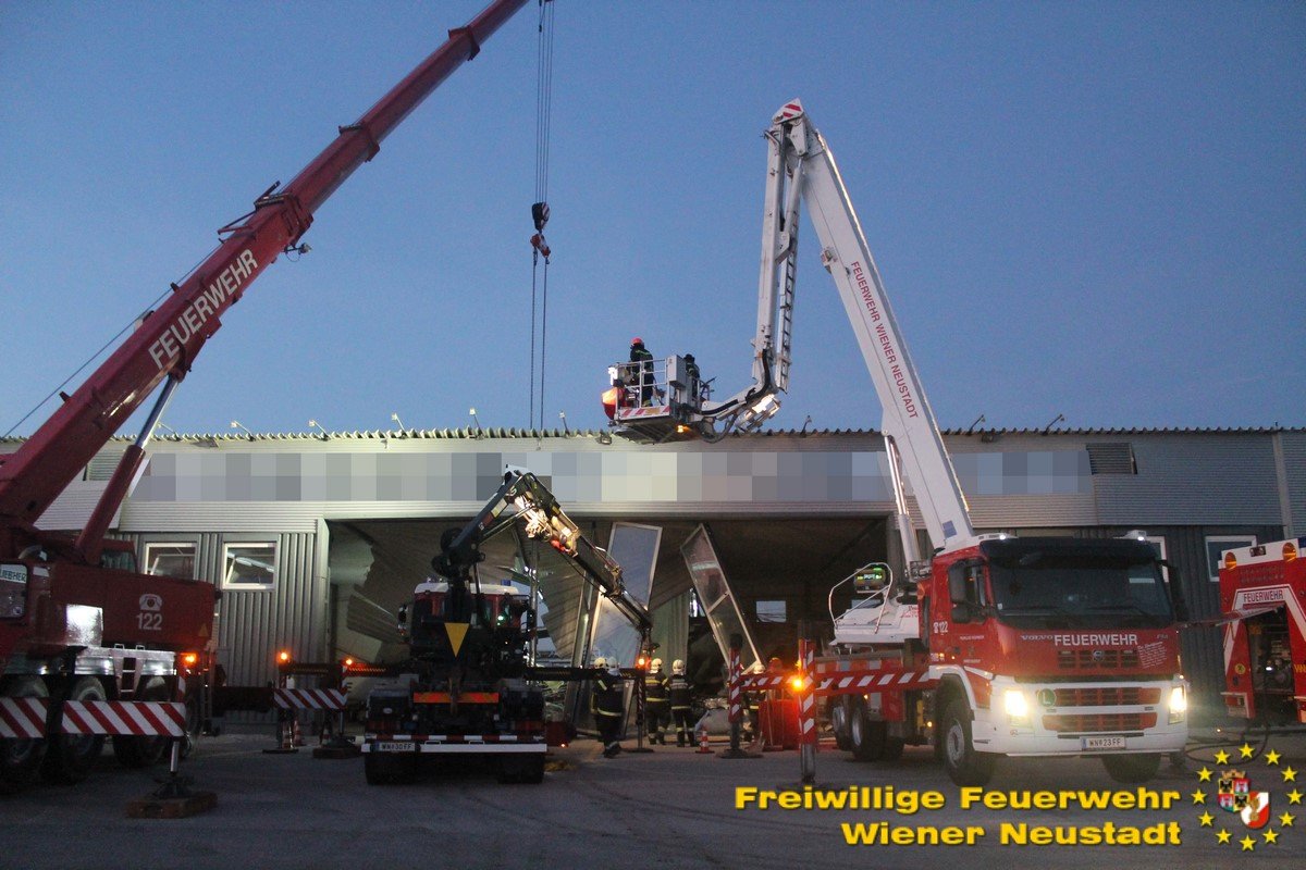 Nach Besprechung mit dem Statiker und der Firmenleitung wurde mit dem Sichern der Halle durch das schwere Kranfahrzeug und den Hubrettungsgeräten der Feuerwehr Wiener Neustadt für die Bergung des Lkw durchgeführt. Der Lkw wurde aus den umgerissenen Stahlträgern behutsam befreit und im Anschluss mittels Seilwinde aus der Halle gezogen.