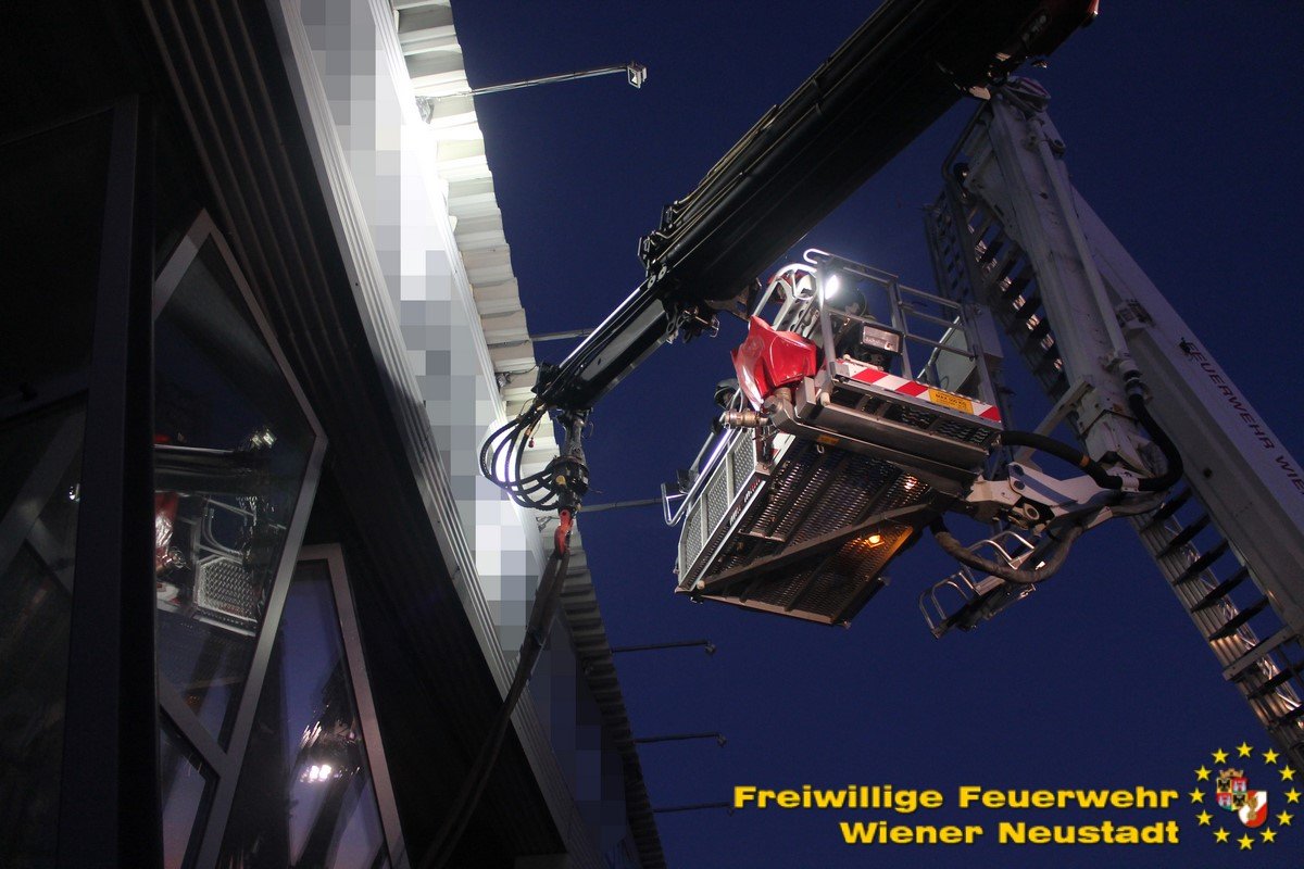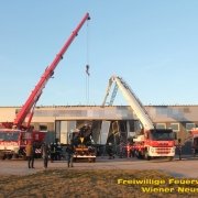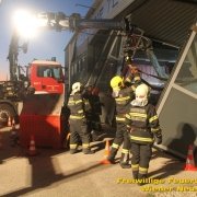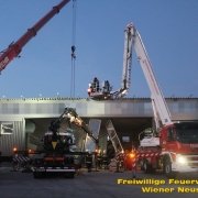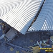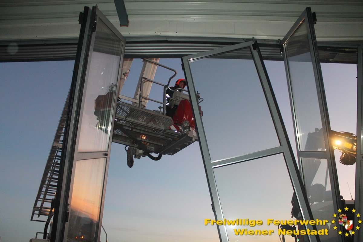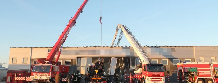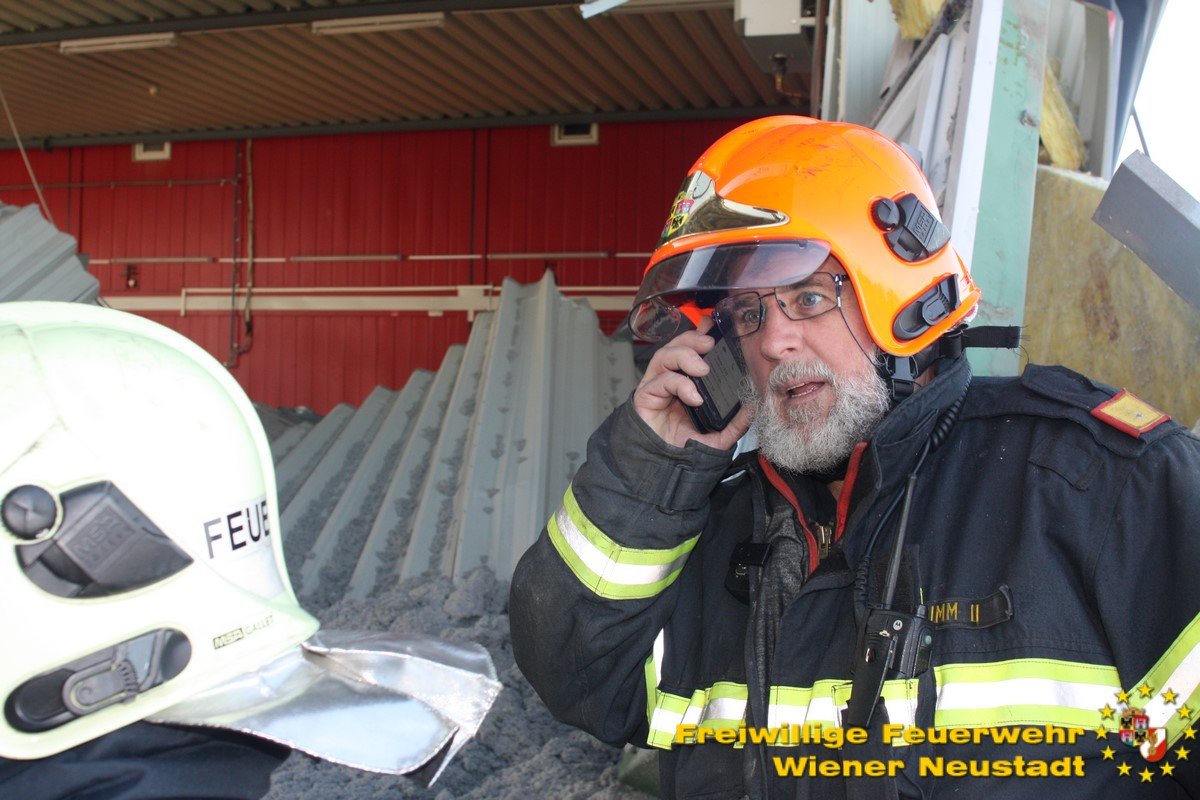 Nach Besprechung mit dem Statiker und der Firmenleitung wurde mit dem Sichern der Halle durch das schwere Kranfahrzeug und den Hubrettungsgeräten der Feuerwehr Wiener Neustadt für die Bergung des Lkw durchgeführt. Der Lkw wurde aus den umgerissenen Stahlträgern behutsam befreit und im Anschluss mittels Seilwinde aus der Halle gezogen.