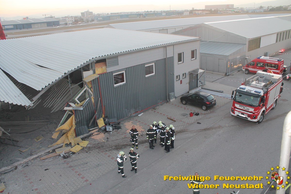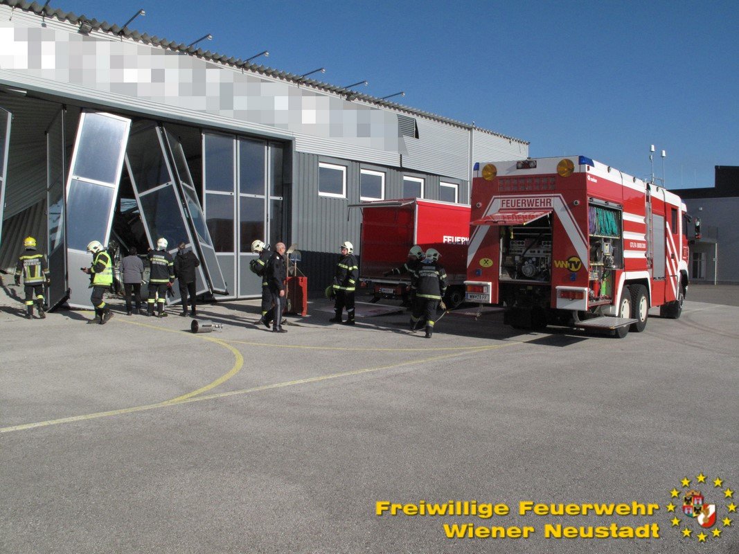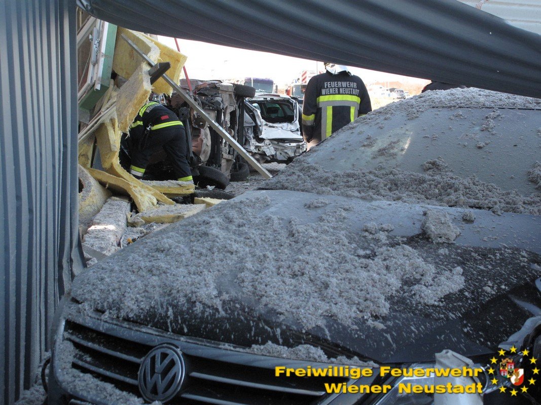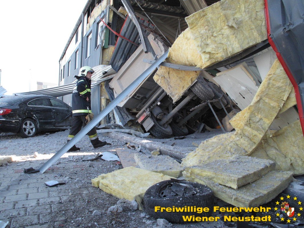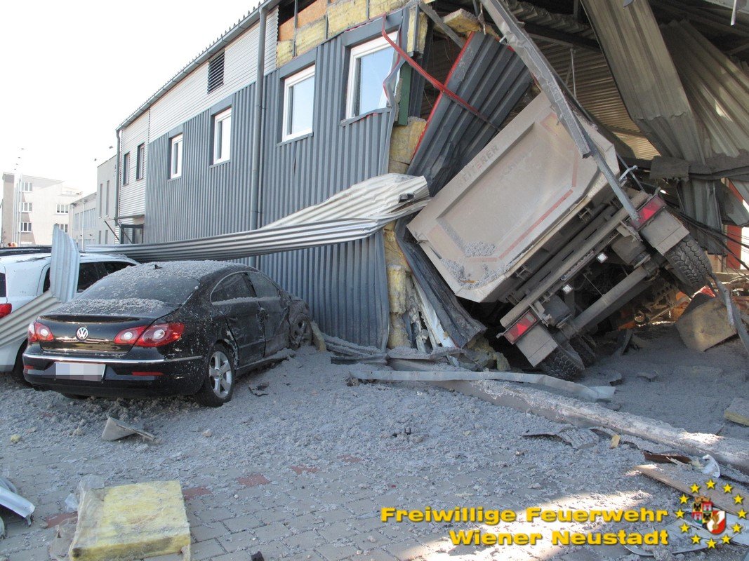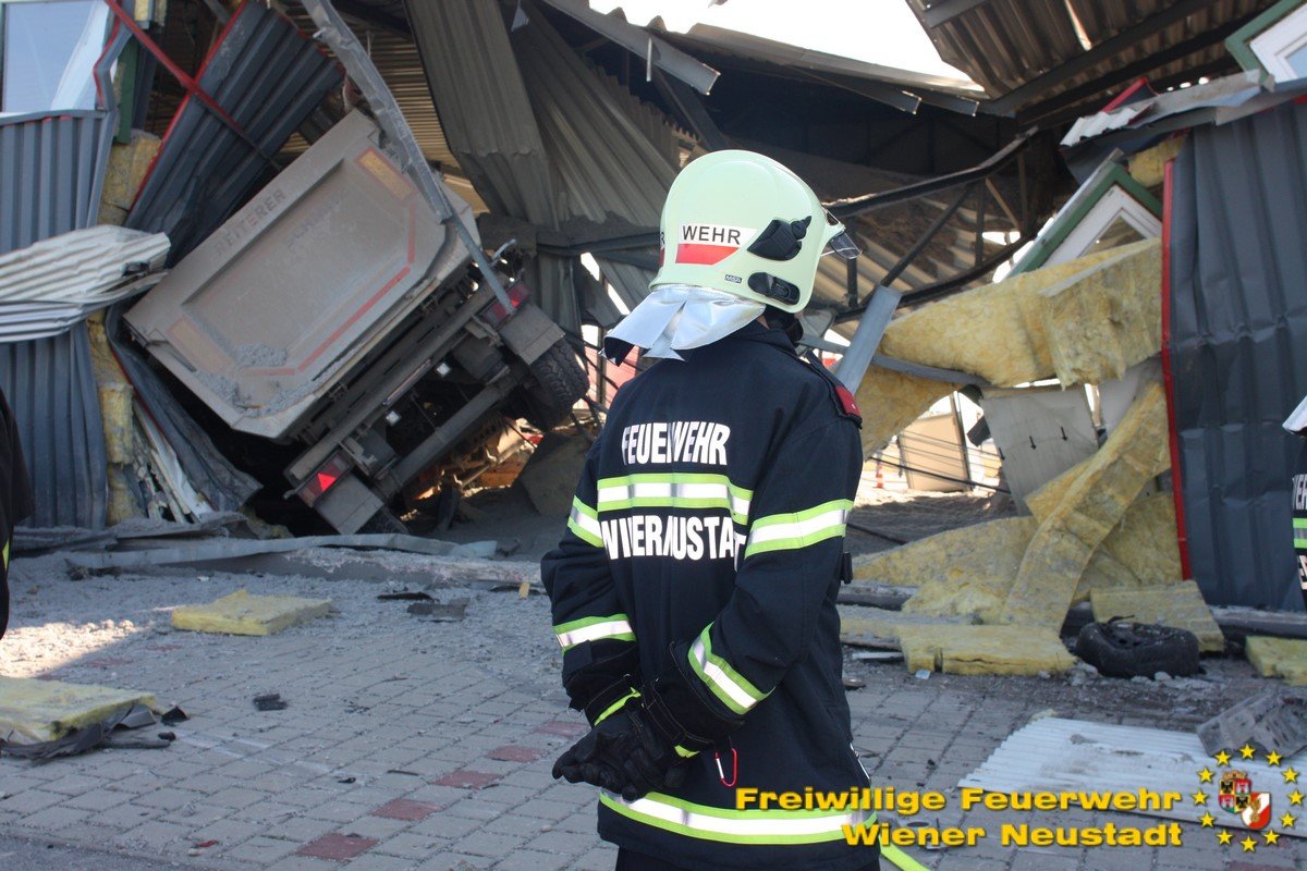 Gegen zwölf Uhr mittags traf in der Bezirksalarm- und -warnzentrale ein Notruf ein, welcher folgende Lage darstellte: Ein Lkw ist in eine Halle gefahren und hat dabei mehrere Fahrzeuge gerammt. Die Halle drohe einzustürzen. Ein Fahrzeug der Feuerwehr Wiener Neustadt machte sich zur Lageerkundung auf den Weg. Es folgte ein Großeinsatz der Feuerwehr.