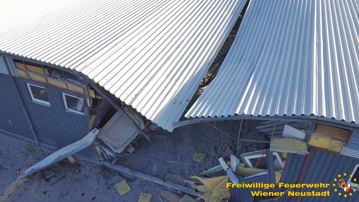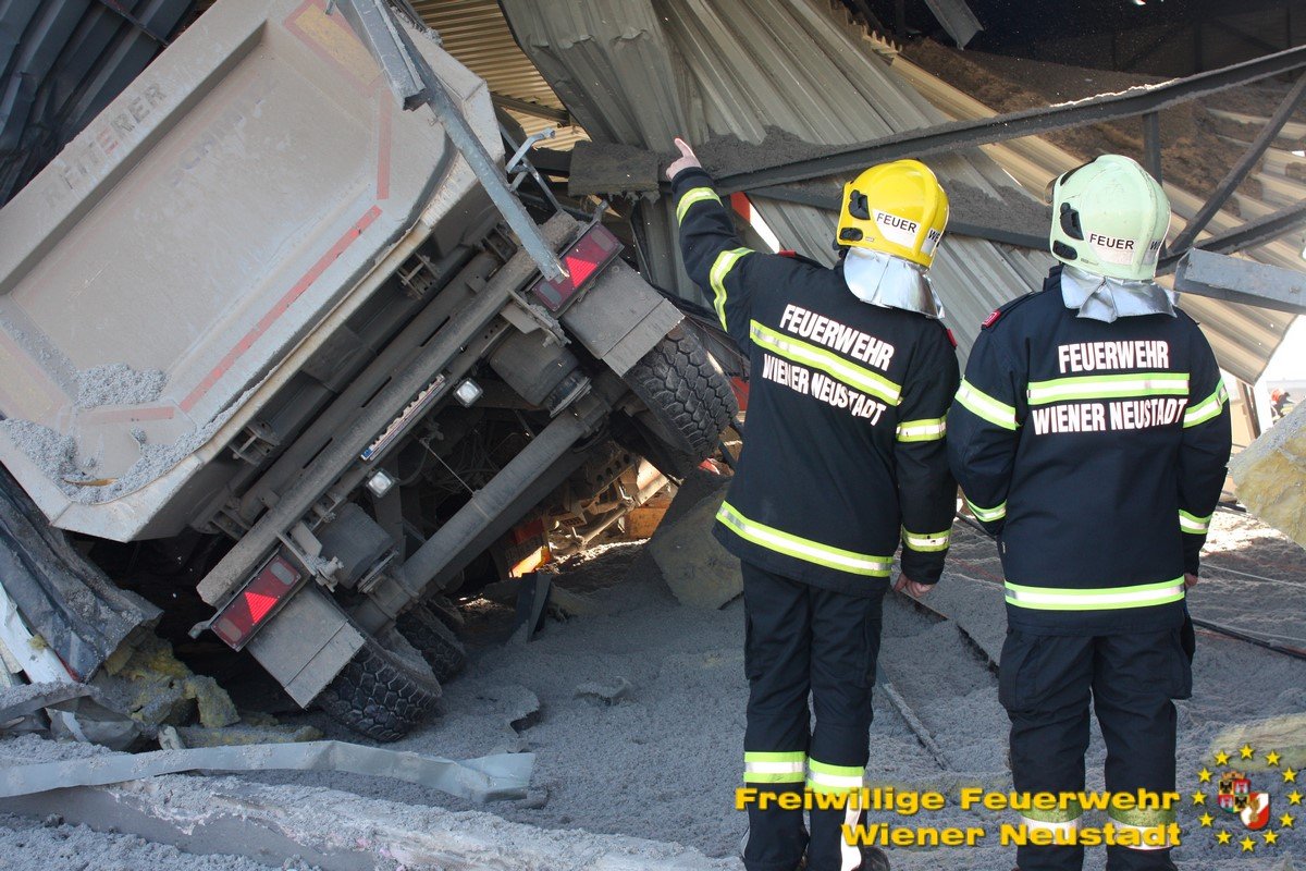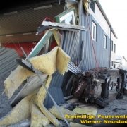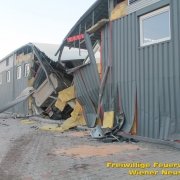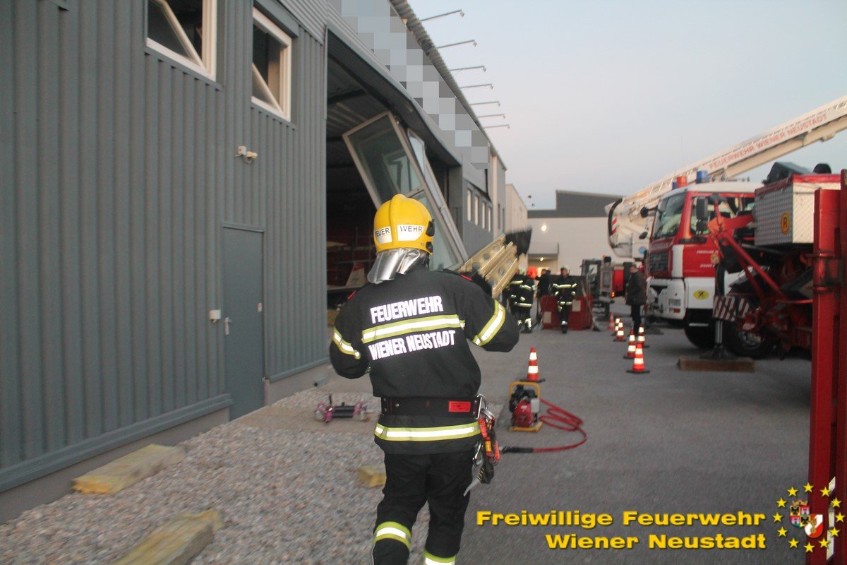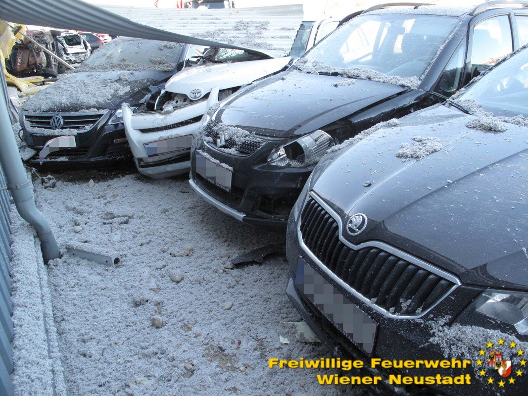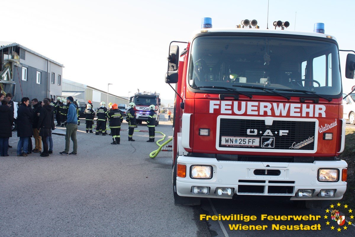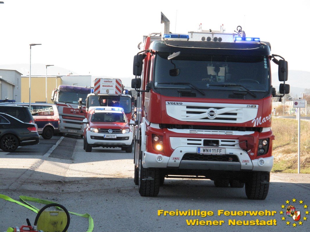 Gegen zwölf Uhr mittags traf in der Bezirksalarm- und -warnzentrale ein Notruf ein, welcher folgende Lage darstellte: Ein Lkw ist in eine Halle gefahren und hat dabei mehrere Fahrzeuge gerammt. Die Halle drohe einzustürzen. Ein Fahrzeug der Feuerwehr Wiener Neustadt machte sich zur Lageerkundung auf den Weg. Es folgte ein Großeinsatz der Feuerwehr.